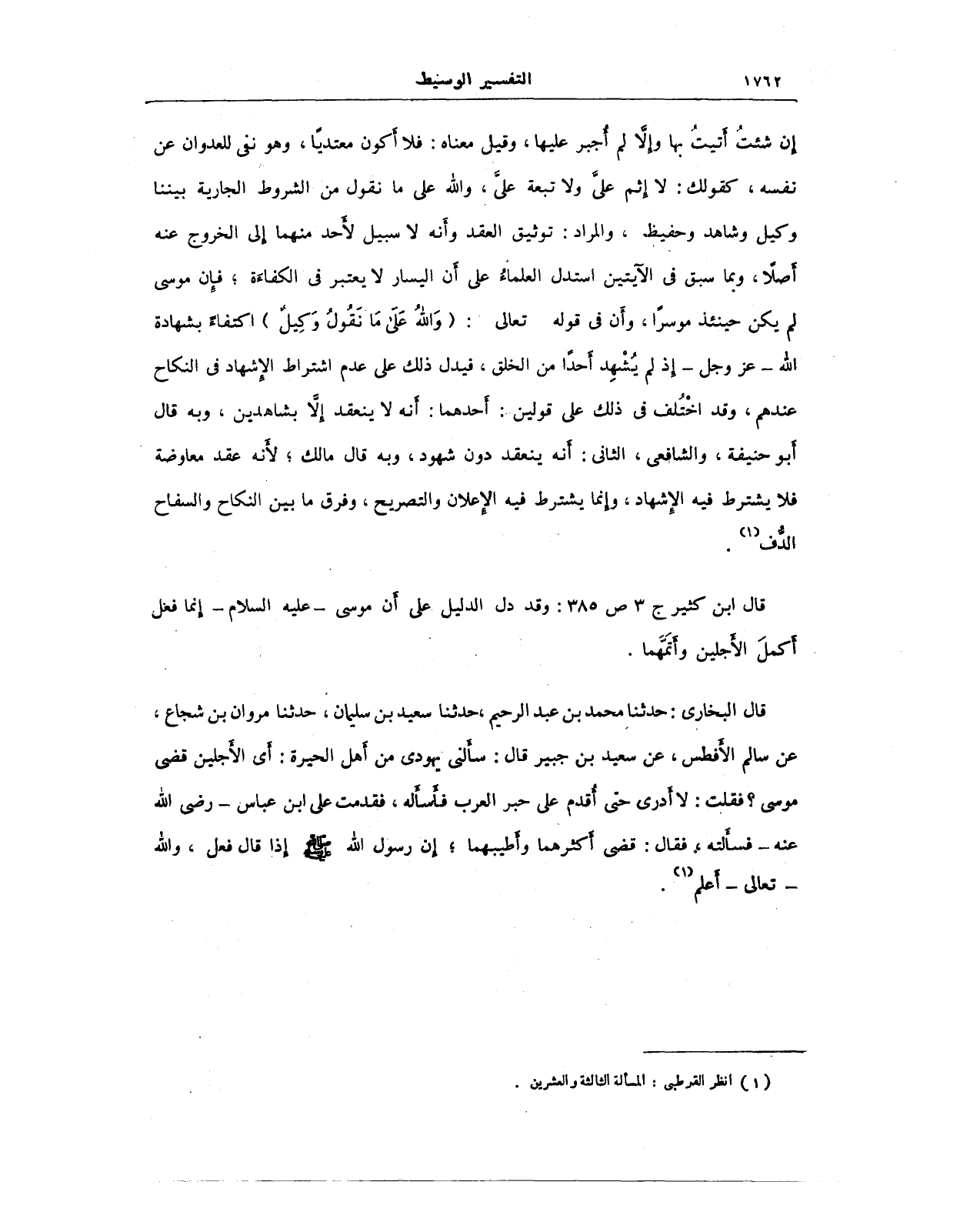 قال البخاري: حدثنا محمد بن عبد الرحيم , حدثنا سعيد بن سلمان، حدثنا مروان بن شجاع، عن سالم الأفطس، عن سعيد بن جبير قال: سألنى يهودى من أهل الحيرة: أي الأجلين قضى موسى؟ فقلت: لا أدرى حتى أُقدم على حبر العرب فأسأله, فقدمت على ابن عباس - رضي الله عنه - فسألته، فقال: قضى أكثرهما وأطيبهما؛ أن رسول الله - صلى الله عليه وسلم - إذا قال فعل، والله - تعالى - أعلم.