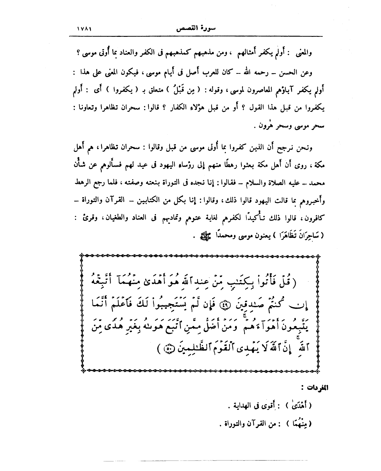 ونحن نرجح أن الذين كفروا بما أوتي موسى من قبل وقالوا: سحران تظاهرا، هم أهل مكة، روى أن أهل مكة بعثوا رهطا منهم إلى رؤساء اليهود في عيد لهم فسألوهم عن شأن محمَّد - عليه الصلاة والسلام - فقالوا: إنا نجده في التوراة بنعته وصفته، فلما رجع الرهط وأخبروهم بما قالت اليهود قالوا ذلك، وقالوا: إنا بكل من الكتابين - القرآن والتوراة - كافرون، قالوا ذلك تأكيدا لكفرهم لغاية عتوهم وتماديهم في العناد والطغيان، وقرئ: {سِحْرَانِ تَظَاهَرَا} يعنون موسى ومحمد - صلى الله عليه وسلم -.