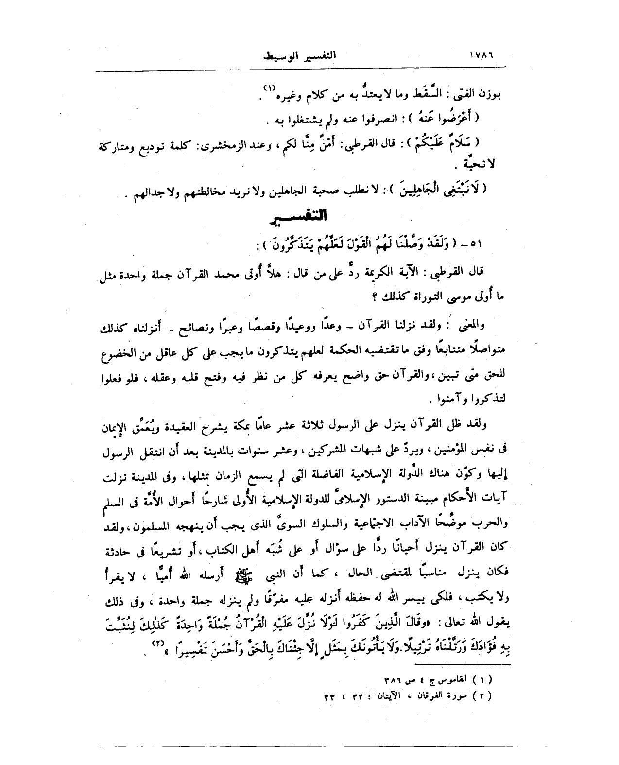 والمعنى: ولقد نزلنا القرآن - وعدًا ووعيدًا وقصصًا وعبرا ونصائح - أنزلناه كذلك متواصلًا متتابعًا وفق ما تقتضيه الحكمة لعلهم يتذكرون ما يجب على كل عاقل من الخضوع للحق متى تبين، والقرآن حق واضح يعرفه كل من نظر فيه وفتح قلبه وعقله، فلو فعلوا لتذكروا وآمنوا.