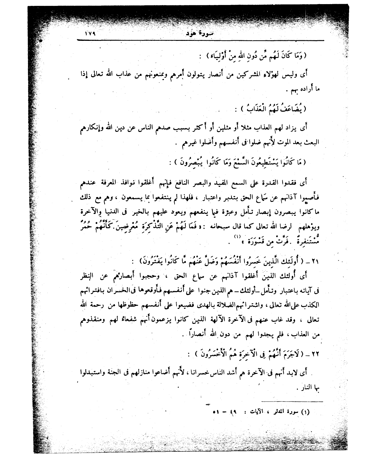 أي أُولئك الذين أَغلقوا آذانهم عن سماع الحق، وحجبوا أبصارهم عن النظر في آياته باعتبار وتأمل - أولئك - هم الذين جنوا على أَنفسهم فأَوقعوها في الخسران بافترائهم الكذب على الله تعالى، واشترائهم الضلالة بالهدى فضيعوا على أنفسهم حظوظها من رحمة الله تعالى، وقد غاب عنهم في الآخرة الآلهة الذين كانوا يزعمون أنهم شفعاءُ لهم ومنقذوهم من العذاب، فم يجدوا لهم من دون الله أنصارًا.