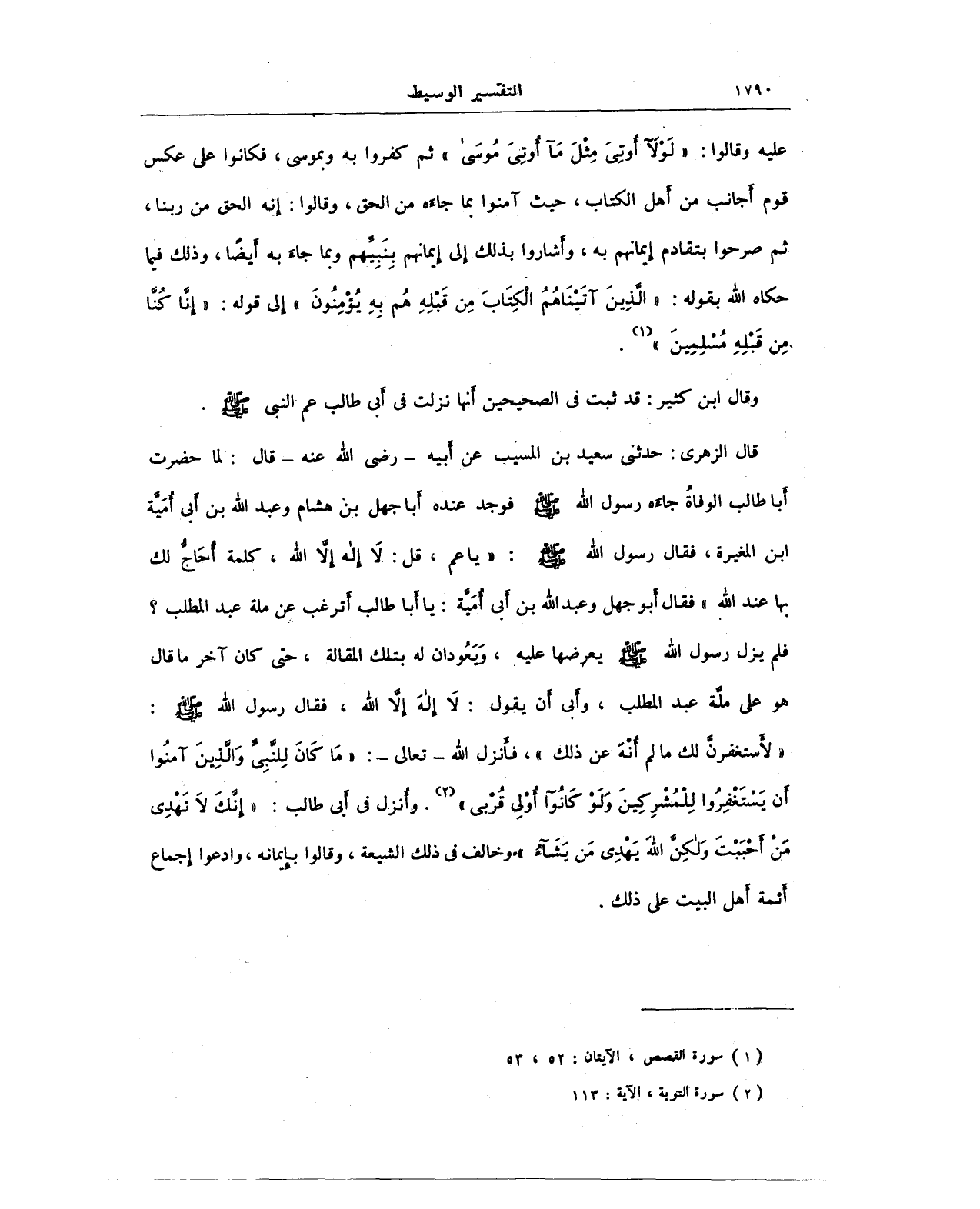 قال الزهري: حدثني سعيد بن المسيب عن أبيه - رضي الله عنه - قال: لما حضرت أبا طالب الوفاةُ جاءه رسول الله - صلى الله عليه وسلم - فوجد عنده أبا جهل بن هشام وعبد الله بن أبي أمَيَّة ابن المغيرة، فقال رسول الله - صلى الله عليه وسلم -: "يا عم، قل: لاَ إله إلاَّ الله، كلمة أحَاجُّ لك بها عند الله" فقال أبو جهل وعبد الله بن أبي أُمَيَّة: يا أبا طالب أترغب عن ملة عبد المطلب؟ فلم يزل رسول الله - صلى الله عليه وسلم - يعرضها عليه -، وَيَعُودان له بتلك المقالة، حتى كان آخر ما قال هو على ملة عبد المطلب، وأبى أن يقول: لا إله إلاَّ الله، فقال رسول الله - صلى الله عليه وسلم -: "لأستغفرن لك ما لم أُنْهَ عن ذلك"، فأنزل الله - تعالى -: {مَا كَانَ لِلنَّبِيِّ وَالَّذِينَ آمَنُوا أَنْ يَسْتَغْفِرُوا لِلْمُشْرِكِينَ وَلَوْ كَانُوا أُولِي قُرْبَى} (¬2). وأُنزل في أبي طالب: {إِنَّكَ لَا تَهْدِي مَنْ أَحْبَبْتَ وَلَكِنَّ اللَّهَ يَهْدِي مَنْ يَشَاءُ} وخالف في ذلك الشيعة، وقالوا بإيمانه، وادعوا إجماع أئمة أهل البيت على ذلك.