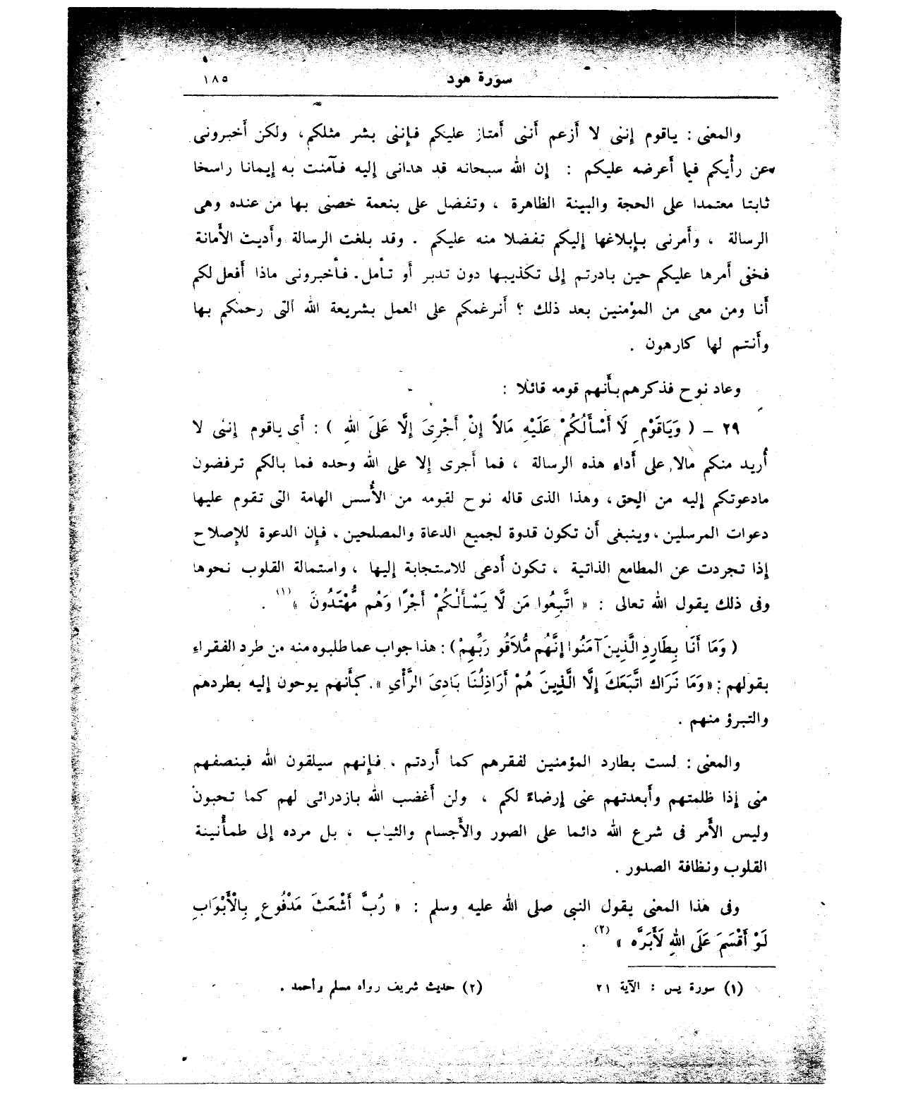 29 - {وَيَا قَوْمِ لَا أَسْأَلُكُمْ عَلَيْهِ مَالًا إِنْ أَجْرِيَ إِلَّا عَلَى اللَّهِ}: أَي يا قوم إننى لا أُريد منكم مالا على أَداءِ هذه الرسالة، فما أَجرى إِلا على الله وحده فما بالكم ترفضون ما دعوتكم اليه من الحق، وهذا الذي قاله نوح لقومه من الأُسس الهامة التي تقوم عليها دعوات المرسلين، وينبغى أن تكون قدوة لجميع الدعاة والمصلحين، فإِن الدعوة للإصلاح إذا تجردت عن المطامع الذاتية، تكون أَدعى للاستجابة إليها، واستمالة القلوب نحوها وفي ذلك يقول الله تعالى: {اتَّبِعُوا مَنْ لَا يَسْأَلُكُمْ أَجْرًا وَهُمْ مُهْتَدُونَ} (¬1).
