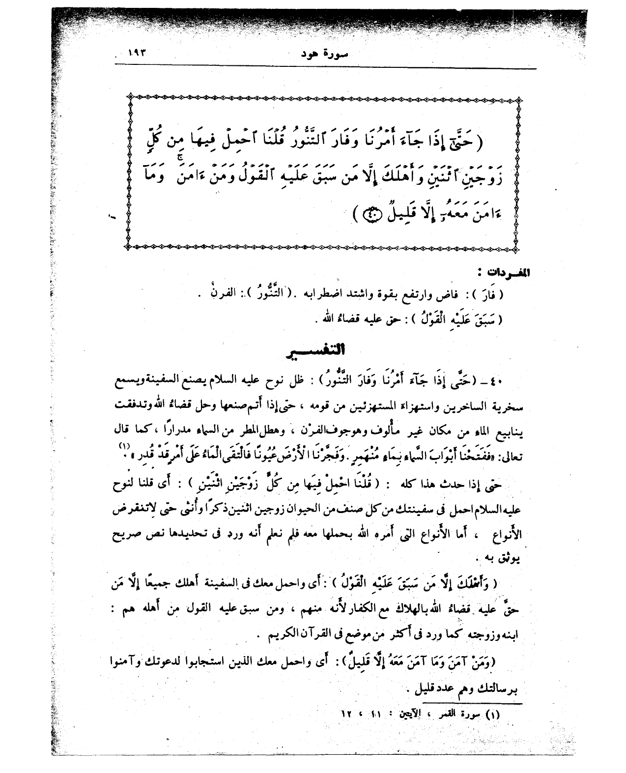 {حَتَّى إِذَا جَاءَ أَمْرُنَا وَفَارَ التَّنُّورُ قُلْنَا احْمِلْ فِيهَا مِنْ كُلٍّ زَوْجَيْنِ اثْنَيْنِ وَأَهْلَكَ إِلَّا مَنْ سَبَقَ عَلَيْهِ الْقَوْلُ وَمَنْ آمَنَ وَمَا آمَنَ مَعَهُ إِلَّا قَلِيلٌ (40)}
