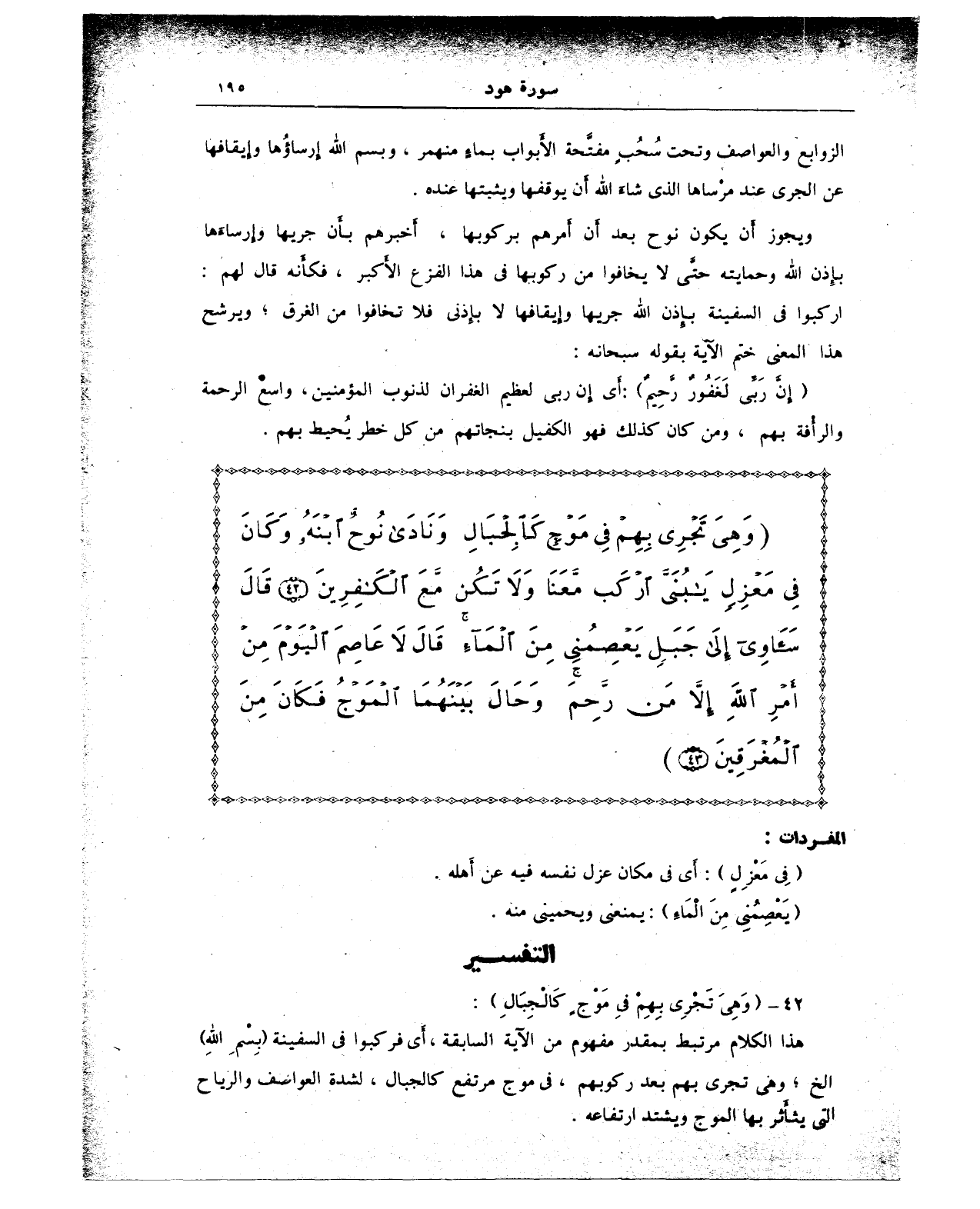 {وَهِيَ تَجْرِي بِهِمْ فِي مَوْجٍ كَالْجِبَالِ وَنَادَى نُوحٌ ابْنَهُ وَكَانَ فِي مَعْزِلٍ يَا بُنَيَّ ارْكَبْ مَعَنَا وَلَا تَكُنْ مَعَ الْكَافِرِينَ (42) قَالَ سَآوِي إِلَى جَبَلٍ يَعْصِمُنِي مِنَ الْمَاءِ قَالَ لَا عَاصِمَ الْيَوْمَ مِنْ أَمْرِ اللَّهِ إِلَّا مَنْ رَحِمَ وَحَالَ بَيْنَهُمَا الْمَوْجُ فَكَانَ مِنَ الْمُغْرَقِينَ (43)}.