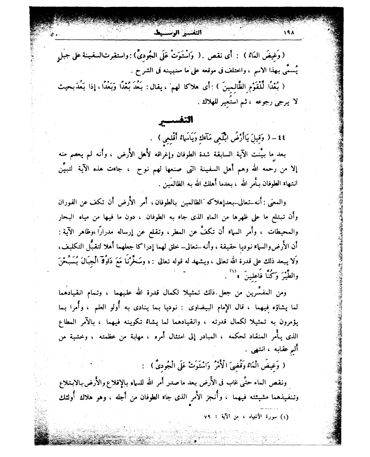 والمعنى: أَنه - تعالى - بعد إهلاكه الظالمين بالطوفان، أَمر الأَرض أَن تكف عن الفوران وأَن تبتلع ما على ظهرها من الماءِ الذي جاءَ به الطوفان، دون ما فيها من مياه البحار والمحيطات، وأَمر السماءَ أن تكفَّ عن المطر، وتقلع عن إرساله مدرارًا، وظاهر الآية: أن الأرض والسماء نوديا حقيقة، وأنه - تعالى - خلق لهما إدراكا جعلهما أَهلا لتقبُّل التكليف، وَلا يبعد ذلك على قدرة الله تعالى، ويشهد له قوله تعالى: {وَسَخَّرْنَا مَعَ دَاوُودَ الْجِبَالَ يُسَبِّحْنَ وَالطَّيْرَ وَكُنَّا فَاعِلِينَ} (¬1).