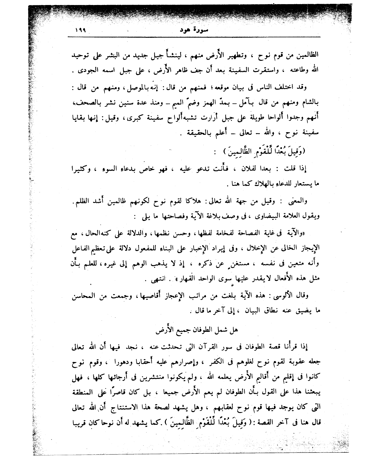 إذا قرأَنا قصة الطوفان في سور القرآن التي تحدثت عنه، نجد فيها أن الله تعالى جعله عقوبة لقوم نوح لغلوهم في الكفر، وإصرارهم عليه أحقابا ودهورا، وقوم نوح كانوا في إقليم من أقاليم الأَرض يعلمه الله، ولم يكونوا منتشرين في أرجائها كلها، فهل يبعثنا هذا على القول بأَن الطوفان لم يعم الأرض جميعا، بل كان قاصرًا على المنطقة التي كان يوجد فيها قوم نوح لعقابهم، وهل يشهد لصحة هذا الاستنتاج أَن الله تعالى قال هنا في آخر القصة: {وَقِيلَ بُعْدًا لِلْقَوْمِ الظَّالِمِينَ}. كما يشهد له أن نوحا كان قريبا