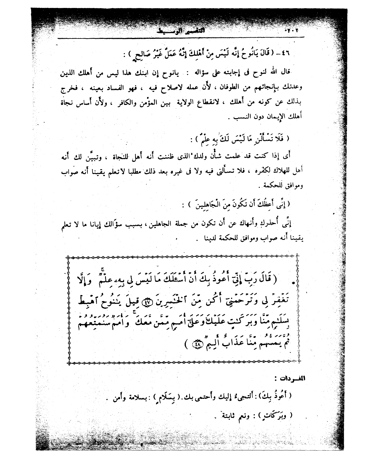 قال الله لنوح في إِجابته على سؤاله: يا نوح إن ابنك هذا ليس من أهلك الذين وعدتك بإنجائهم من الطوفان، لأَن عمله لا صلاح فيه، فهو الفساد بعينه، فخرج بذلك عن كونه من أَهلك، لانقطاع الولاية بين المؤْمن والكافر، ولأَن أَساس نجاة أَهلك الإِيمان دون النسب.