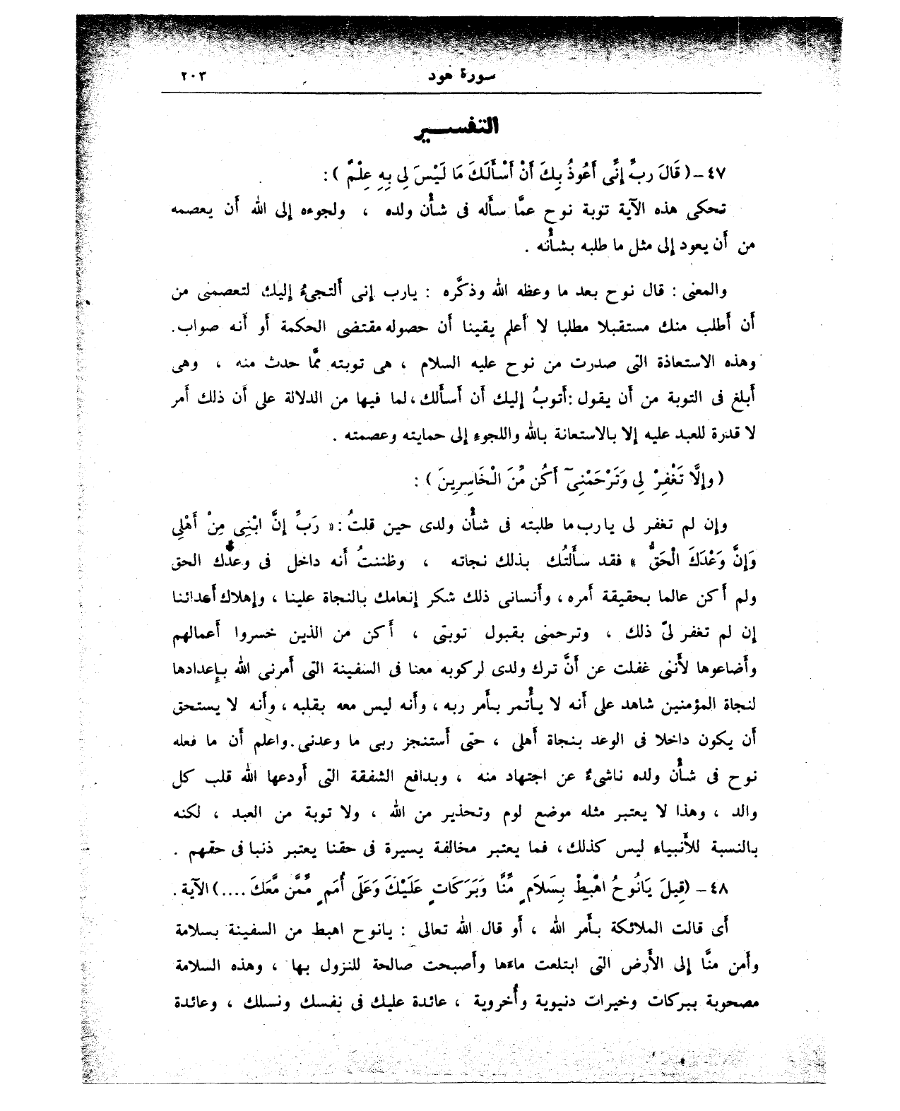 وإِن لم تغفر لى يا رب ما طلبته في شأْن ولدى حين قلتُ: {رَبِّ إِنَّ ابْنِي مِنْ أَهْلِي وَإِنَّ وَعْدَكَ الْحَقُّ} فقد سأَلتُك بذلك نجاته، وظننتُ أنه داخل في وعدك الحق ولم أَكن عالما بحقيقة أَمره، وأَنسانى ذلك شكر إِنعامك بالنجاة علينا، وإهلاك أَعدائنا إِن لم تغفر ليّ ذلك، وترحمنى بقبول توبتى، أكن من الذين خسروا أَعمالهم وأَضاعوها لأَننى غفلت عن أَنَّ ترك ولدى لركوبه معنا في السفينة التي أَمرنى الله بإِعدادها لنجاة المؤمنين شاهد على أنه لا يأْتمر بأَمر ربه، وأَنه ليس معه بقلبه، وأنه لا يستحق أن يكون داخلا في الوعد بنجاة أَهلى، حتى أستنجز ربي ما وعدنى. واعلم أَن ما فعله نوح في شأْن ولده ناشىءٌ عن اجتهاد منه، وبدافع الشفقة التي أودعها الله قلب كل والد، وهذا لا يعتبر مثله موضع لوم وتحذير من الله، ولا توبة من العبد، لكنه بالنسبة للأَنبياءِ ليس كذلك، فما يعتبر مخالفة يسيرة في حقنا يعتبر ذنبا في حقهم.