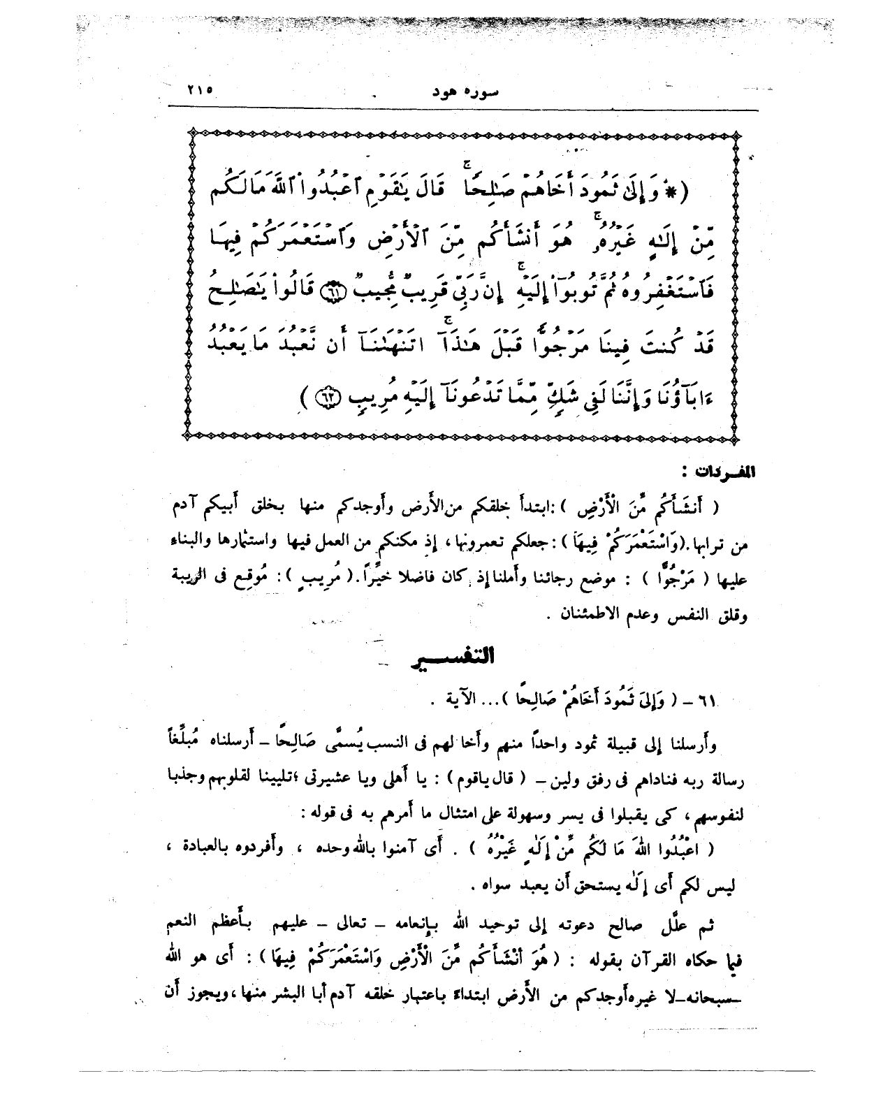 {وَإِلَى ثَمُودَ أَخَاهُمْ صَالِحًا قَالَ يَا قَوْمِ اعْبُدُوا اللَّهَ مَا لَكُمْ مِنْ إِلَهٍ غَيْرُهُ هُوَ أَنْشَأَكُمْ مِنَ الْأَرْضِ وَاسْتَعْمَرَكُمْ فِيهَا فَاسْتَغْفِرُوهُ ثُمَّ تُوبُوا إِلَيْهِ إِنَّ رَبِّي قَرِيبٌ مُجِيبٌ (61) قَالُوا يَا صَالِحُ قَدْ كُنْتَ فِينَا مَرْجُوًّا قَبْلَ هَذَا أَتَنْهَانَا أَنْ نَعْبُدَ مَا يَعْبُدُ آبَاؤُنَا وَإِنَّنَا لَفِي شَكٍّ مِمَّا تَدْعُونَا إِلَيْهِ مُرِيبٍ (62)}