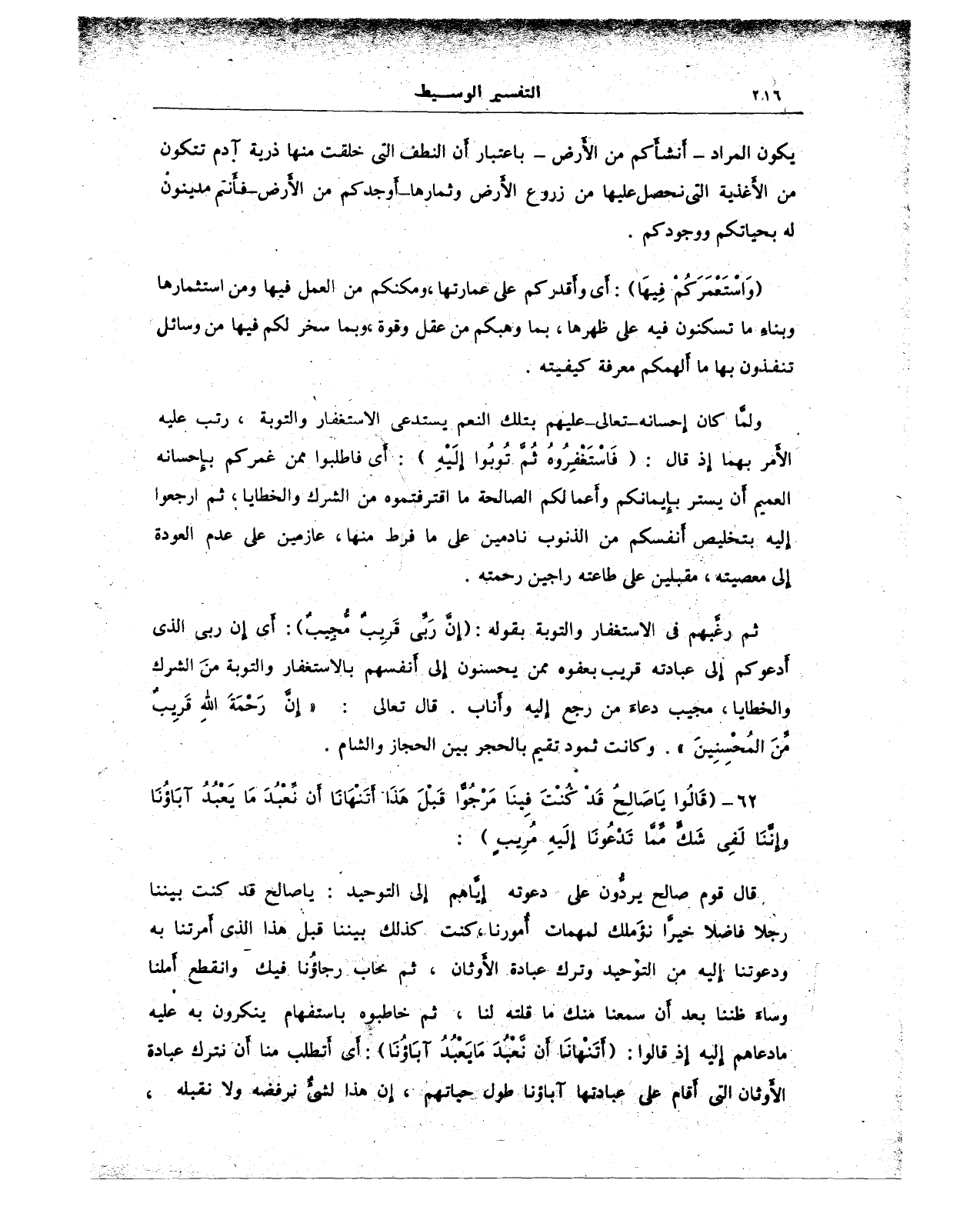 قال قوم صالح يردُّون على دعوته إيَّاهم إِلى التوحيد: يا صالح قد كنت بيننا رجلا فاضلا خيرًا نؤَملك لمهمات أُمورنا، كنت كذلك بيننا قبل هذا الذي أَمرتنا به ودعوتنا إِليه من التوحيد وترك عبادة الأَوثان، ثم خاب رجاؤُنا فيك وانقطع أَملنا وساءَ ظننا بعد أن سمعنا منك ما قلته لنا، ثم خاطبوه باستفهام ينكرون به عليه ما دعاهم إليه إذ قالوا: {أَتَنْهَانَا أَنْ نَعْبُدَ مَا يَعْبُدُ آبَاؤُنَا} أَي أتطلب منا أَن نترك عبادة الأوثان التي أقام على عبادتها آباؤنا طول حياتهم، إن هذا لشىءٌ نرفضه ولا نقبله،