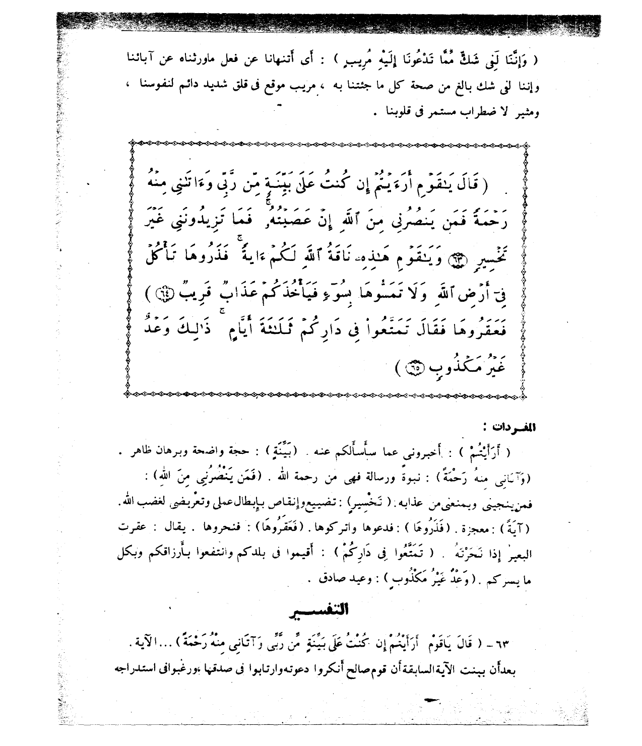 {قَالَ يَا قَوْمِ أَرَأَيْتُمْ إِنْ كُنْتُ عَلَى بَيِّنَةٍ مِنْ رَبِّي وَآتَانِي مِنْهُ رَحْمَةً فَمَنْ يَنْصُرُنِي مِنَ اللَّهِ إِنْ عَصَيْتُهُ فَمَا تَزِيدُونَنِي غَيْرَ تَخْسِيرٍ (63) وَيَا قَوْمِ هَذِهِ نَاقَةُ اللَّهِ لَكُمْ آيَةً فَذَرُوهَا تَأْكُلْ فِي أَرْضِ اللَّهِ وَلَا تَمَسُّوهَا بِسُوءٍ فَيَأْخُذَكُمْ عَذَابٌ قَرِيبٌ (64) فَعَقَرُوهَا فَقَالَ تَمَتَّعُوا فِي دَارِكُمْ ثَلَاثَةَ أَيَّامٍ ذَلِكَ وَعْدٌ غَيْرُ مَكْذُوبٍ (65)}