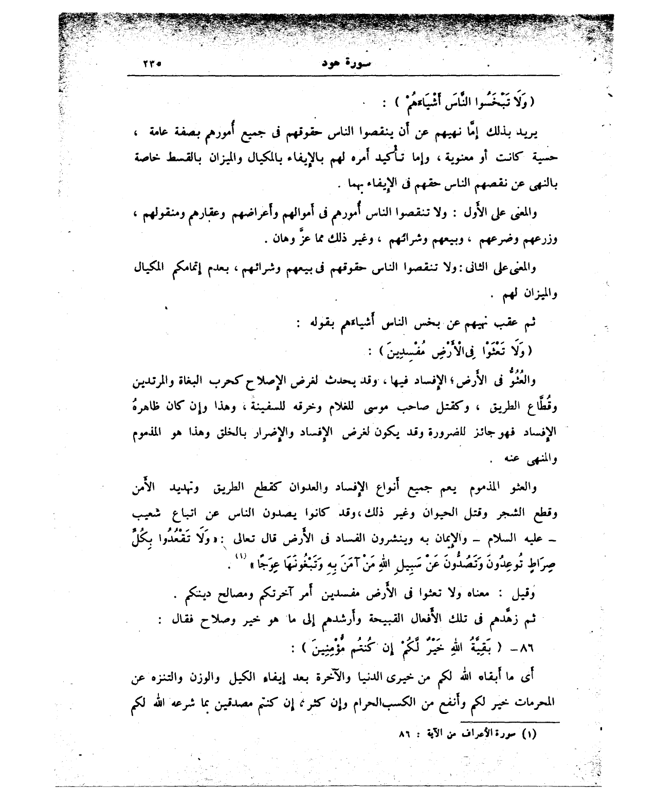 يريد بذلك إما نهيهم عن أن ينقصوا الناس حقوقهم في جميع أمورهم بصفة عامة، حسية كانت أو معنوية، وإِما تأكيد أمره لهم بالإيفاء بالمكيال والميزان بالقسط خاصة بالنهي عن نقصهم الناس حقهم في الإيفاء بهما.