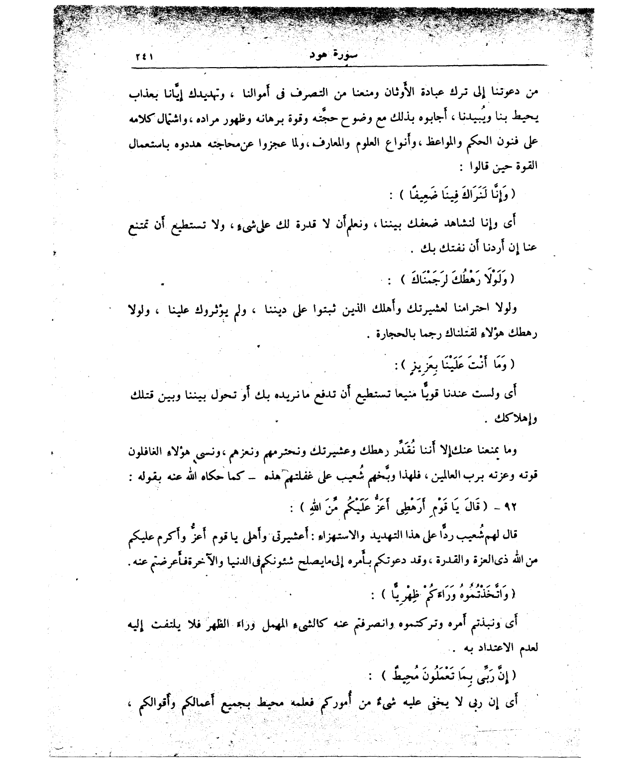 92 - {قَالَ يَا قَوْمِ أَرَهْطِي أَعَزُّ عَلَيْكُمْ مِنَ اللَّهِ}: