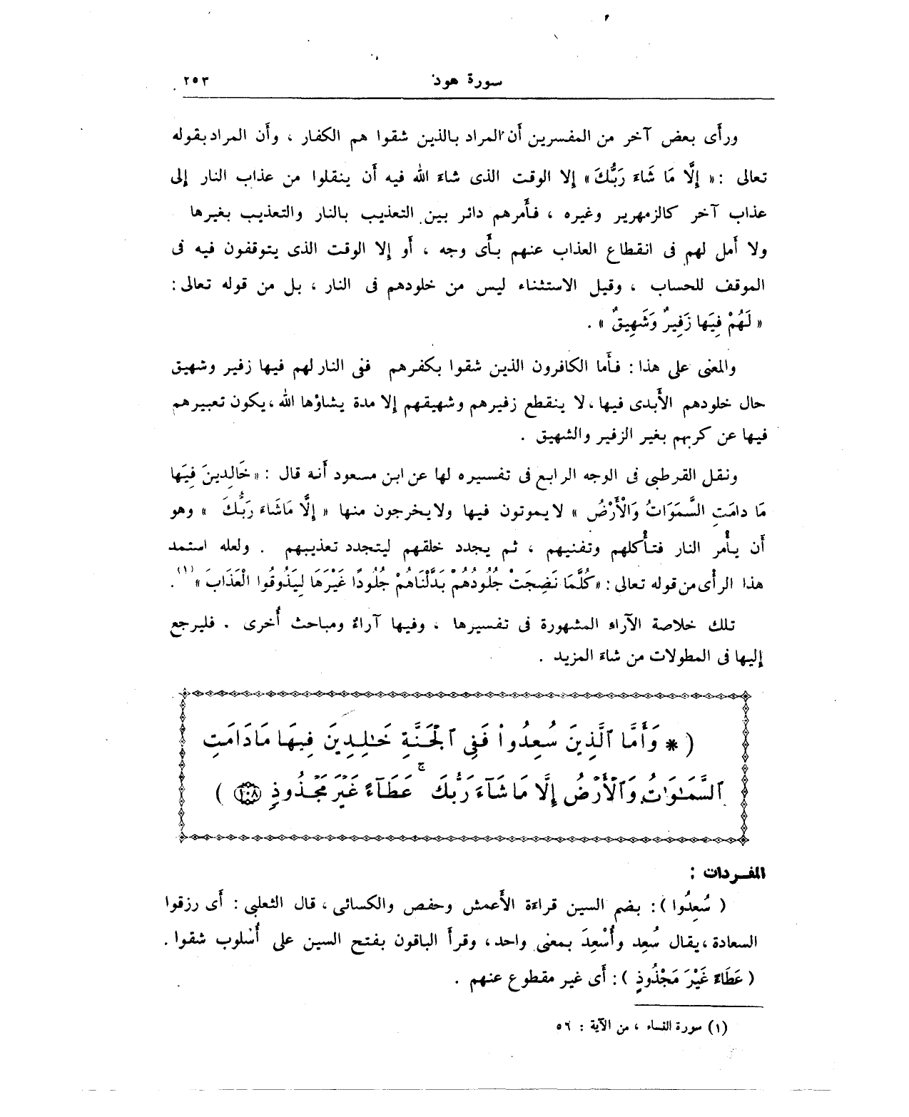 {وَأَمَّا الَّذِينَ سُعِدُوا فَفِي الْجَنَّةِ خَالِدِينَ فِيهَا مَا دَامَتِ السَّمَاوَاتُ وَالْأَرْضُ إِلَّا مَا شَاءَ رَبُّكَ عَطَاءً غَيْرَ مَجْذُوذٍ (108)}