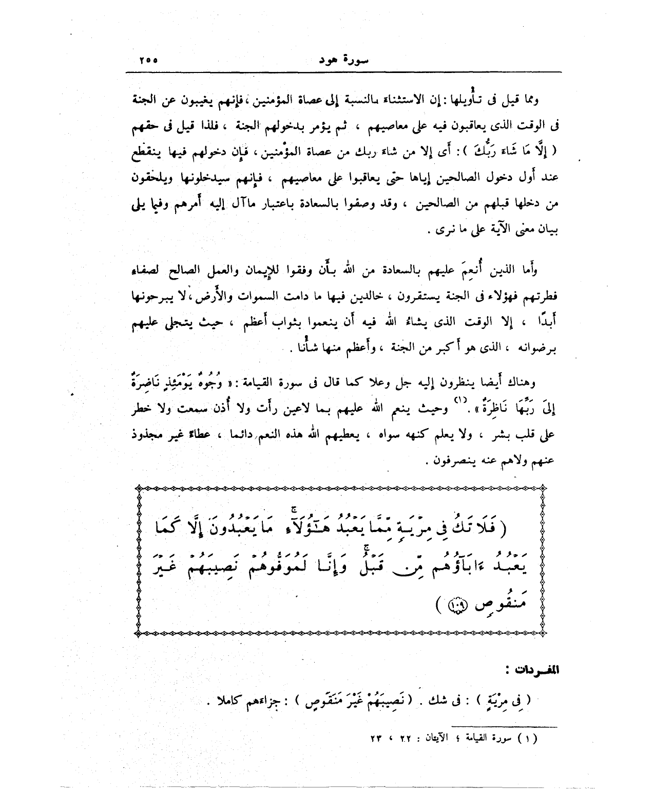 {فَلَا تَكُ فِي مِرْيَةٍ مِمَّا يَعْبُدُ هَؤُلَاءِ مَا يَعْبُدُونَ إِلَّا كَمَا يَعْبُدُ آبَاؤُهُمْ مِنْ قَبْلُ وَإِنَّا لَمُوَفُّوهُمْ نَصِيبَهُمْ غَيْرَ مَنْقُوصٍ (109)}