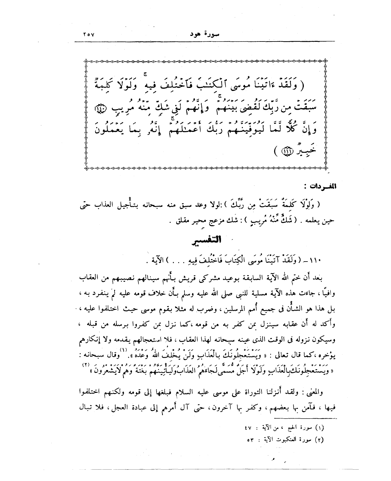 {وَلَقَدْ آتَيْنَا مُوسَى الْكِتَابَ فَاخْتُلِفَ فِيهِ وَلَوْلَا كَلِمَةٌ سَبَقَتْ مِنْ رَبِّكَ لَقُضِيَ بَيْنَهُمْ وَإِنَّهُمْ لَفِي شَكٍّ مِنْهُ مُرِيبٍ (110) وَإِنَّ كُلًّا لَمَّا لَيُوَفِّيَنَّهُمْ رَبُّكَ أَعْمَالَهُمْ إِنَّهُ بِمَا يَعْمَلُونَ خَبِيرٌ (111)}