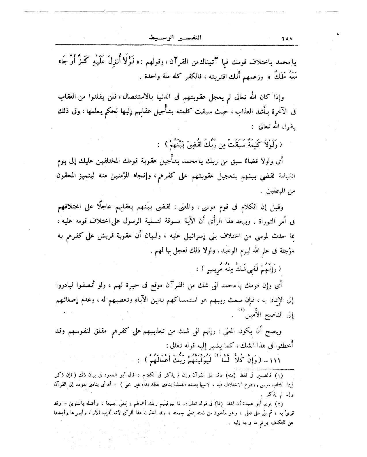 وقيل إن الكلام في قوم موسى, والمعنى: لقضي بينهم بعقابهم عاجلًا على اختلافهم في أمر التوراة. ويبعد هذا الرأي أن الآية مسوقة لتسلية الرسول على اختلاف قومه عليه، بما حدث لموسى من اختلاف بني إسرائيل علية، ولبيان أَن عقوبة قريش على كفرهم به مؤجلة في علم الله الوعيد، ولولا ذلك لعجل بها لهم.