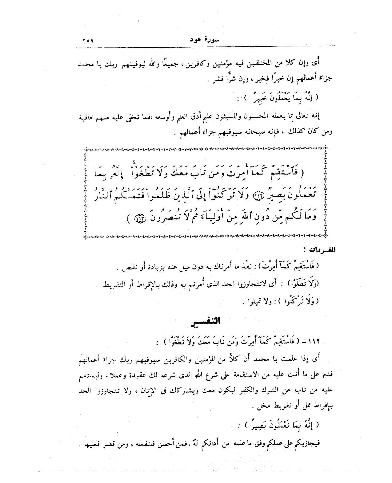 أَي إِذا علمت يا محمد أَن كلاًّ من المؤمنين والكافرين سيوفيهم ربك جزاء أعمالهم فدم على ما أنتم عليه من الاستقامة على شرع الله الذي شرعه لك عقيدة وعملا, وليستقم عليه من تاب عن الشرك والكفر ليكون معك ويشاركك في الإيمان، ولا تتجاوزوا الحد بإِفراط ممل أَو تفريط مخل.