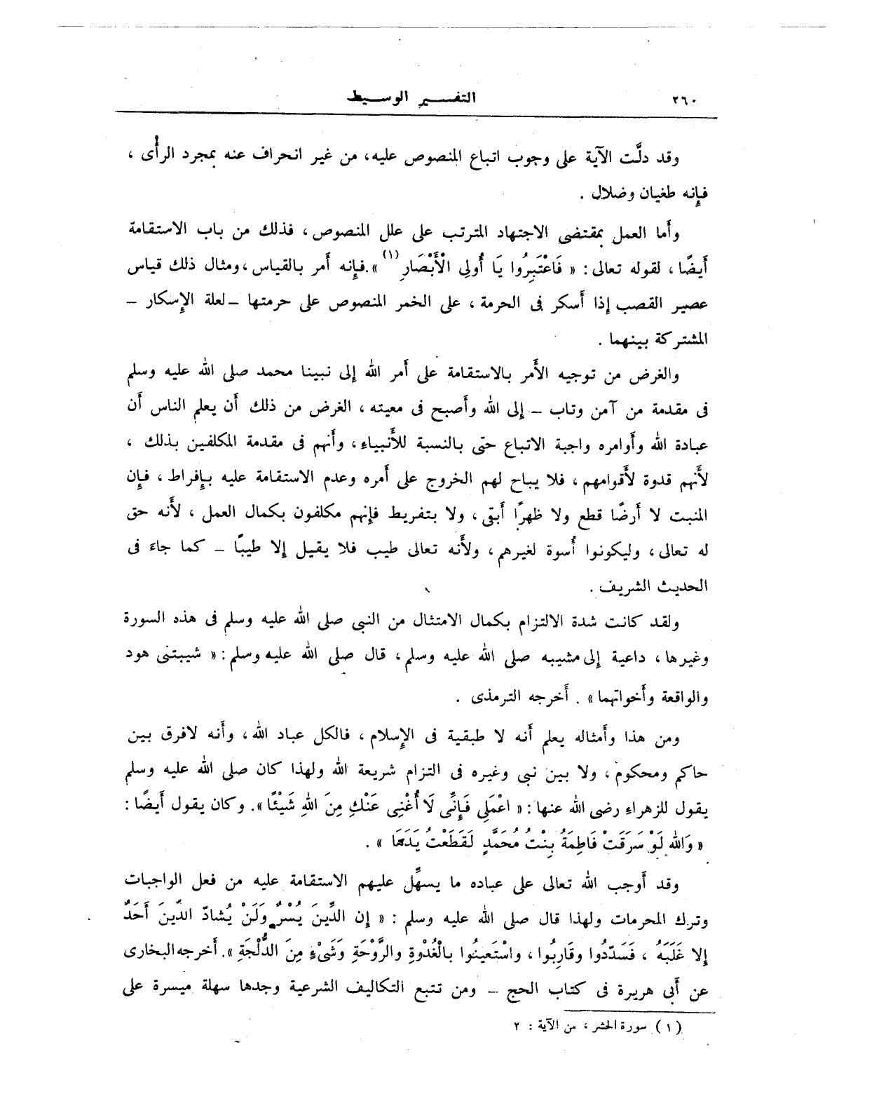 وأَما العمل بمقتضى الاجتهاد المترتب على علل المنصوص، فذلك من باب الاستقامة أيضًا، لقوله تعالى: "فَاعْتَبِرُوا يَا أولِى الْأَبْصَارِ (¬1) " فإِنه أَمر بالقياس، ومثال ذلك قياس عصير القصب إِذا أسكر في الحرمة، على الخمر المنصوص على حرمتها - لعلة الإِسكار - المشتركة بينهما.