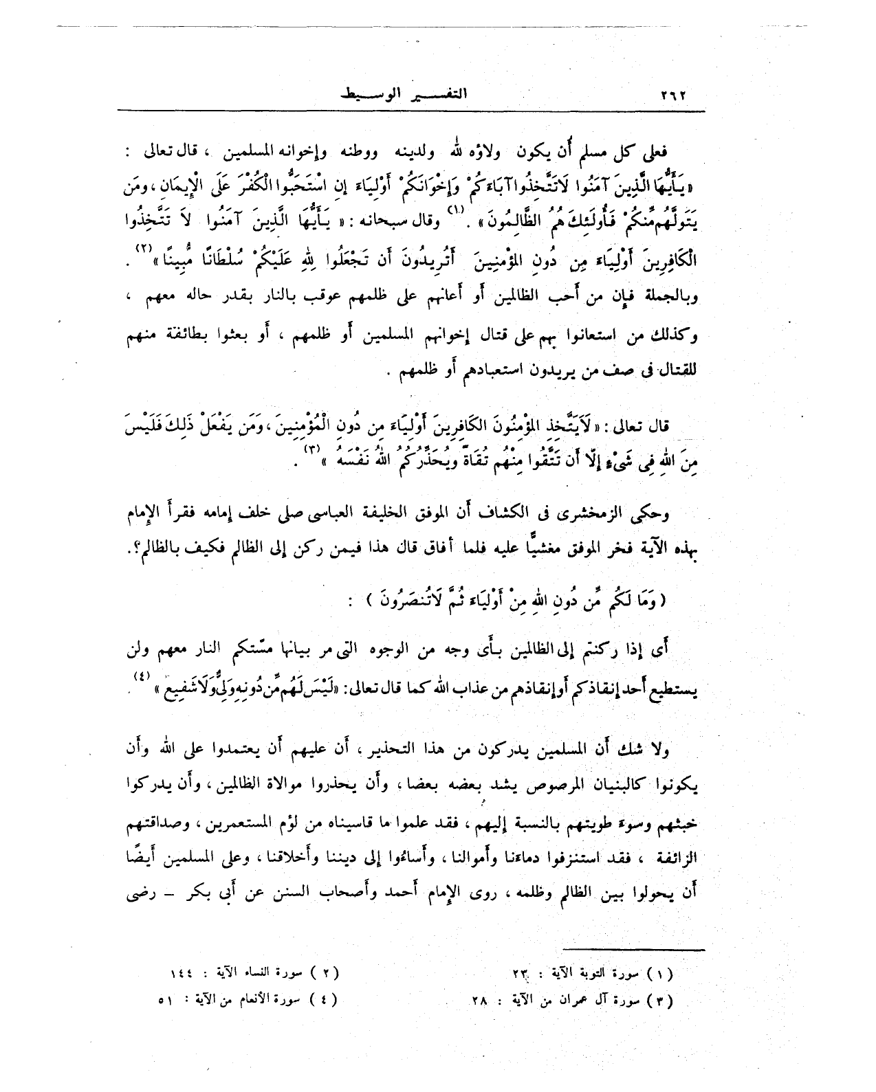 ولا شك أن المسلمين يدركون من هذا التحذير، أَن عليهم أن يعتمدوا على الله وأن يكونوا كالبنيان المرصوص يشد، بعضه بعضا، وإن يحذروا موالاة الظالمين، وأَن يدركوا خبثهم وسوء طويتهم بالنسبة إليهم، فقد علموا ما قاسيناه من لؤم المستعمرين، وصداقتهم الزائفة، فقد استنزفوا دماءنا وأَموالنا، وأساءُوا إلى ديننا وأَخلاقنا، وعلى المسلمين أَيضًا أن يحولوا بين الظالم وظلمه، روى الإمام أحمد وأَصحاب السنن عن أَبي بكر - رضى
