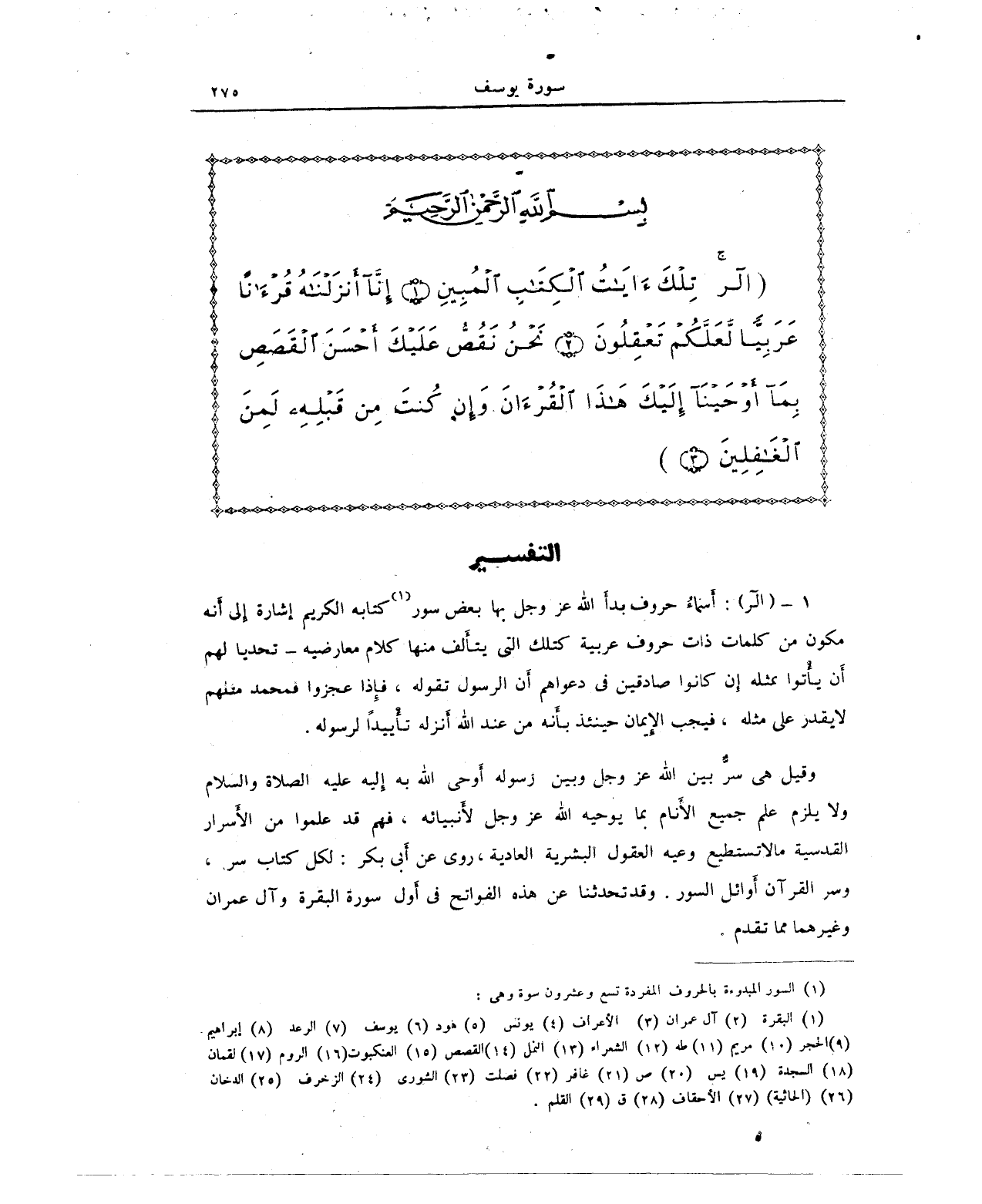 (1) البقرة (2) آل عمران (3) الأعراف (4) يونس (5) هود (6) يوسف (7) الرعد (8) إبراهيم (9) الحجر (10) مريم (11) طه (12) الشعراء (13) النمل (14) القصص (15) العنكبوت (16) الروم (17) لقمان (18) السجدة (19) يس (20) ص (21) غافر (22) فصلت (23) الشورى (24) الزخرف (25) الدخان (26) (الجاثية) (27) الأحقاف (28) ق (29) القلم.
