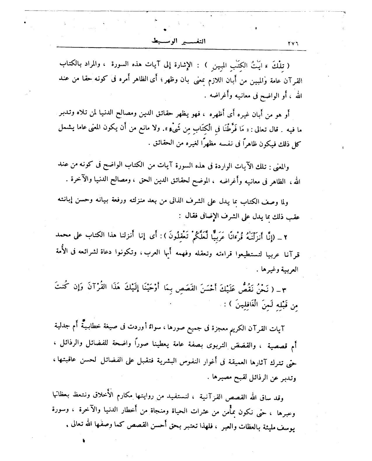 {تِلْكَ آيَاتُ الْكِتَابِ الْمُبِينِ}: الإشارة إلى آيات هذه السورة، والمراد بالكتاب القرآن عامة والمبين من أَبان اللازم بمعنى بان وظهر، أي الظاههر أَمره في كونه حقا من عند الله، أو الواضح في معانه وأَغراضه.