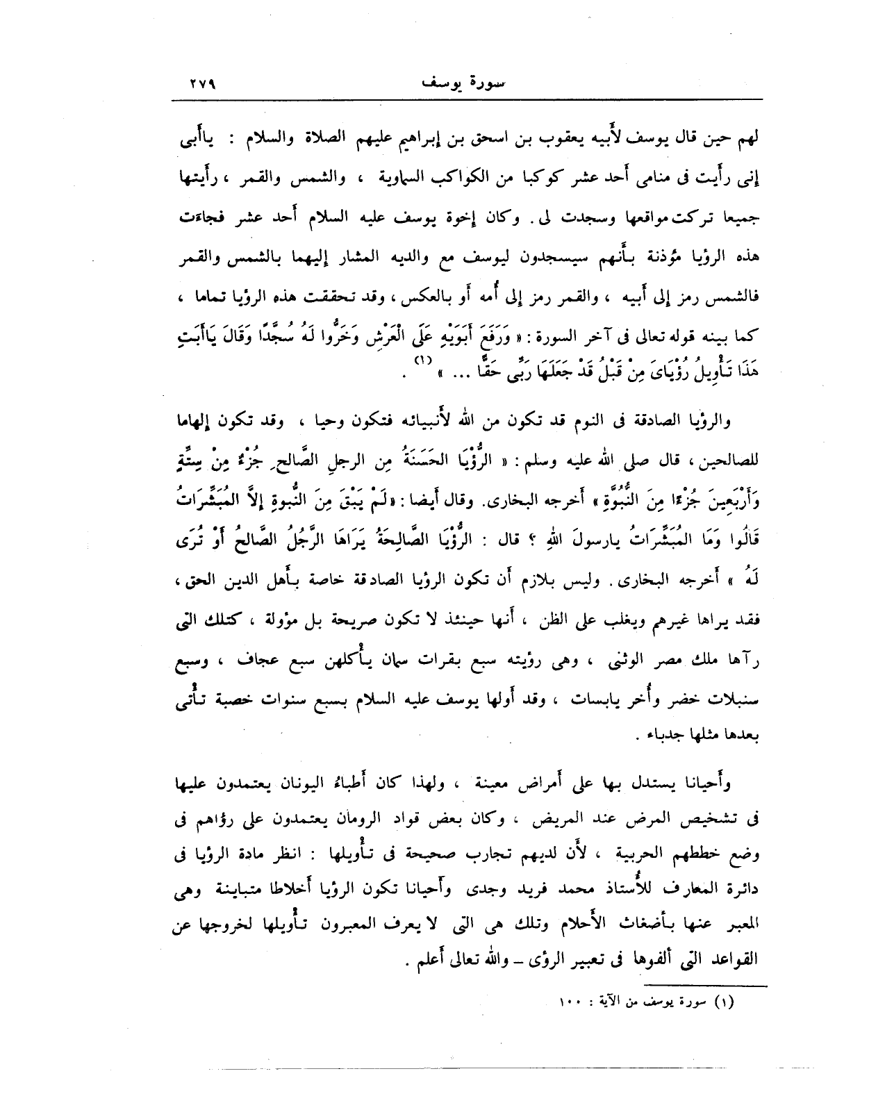 وأحيانا يستدل بها على أمراض معينة، ولهذا كان أطباءُ اليونان يعتمدون عليها في تشخيص المرض عند المريض, وكان بعض قواد الرومان يعتمدون على رؤاهم في وضع خططهم الحربية، لأَن لديهم تجارب صحيحة في تأويلها: انظر مادة الرؤيا في دائرة المعارف للأستاذ محمد فريد وجدى وأحيانا تكون الرؤيا أخلاطا متباينة وهى المعبر عنها بأضغاث الأحلام وتلك هي التي لا يعرف المعبرون تأويلها لخروجها عن القواعد التي ألفوها في تعبير الرؤى - والله تعالى أعلم.