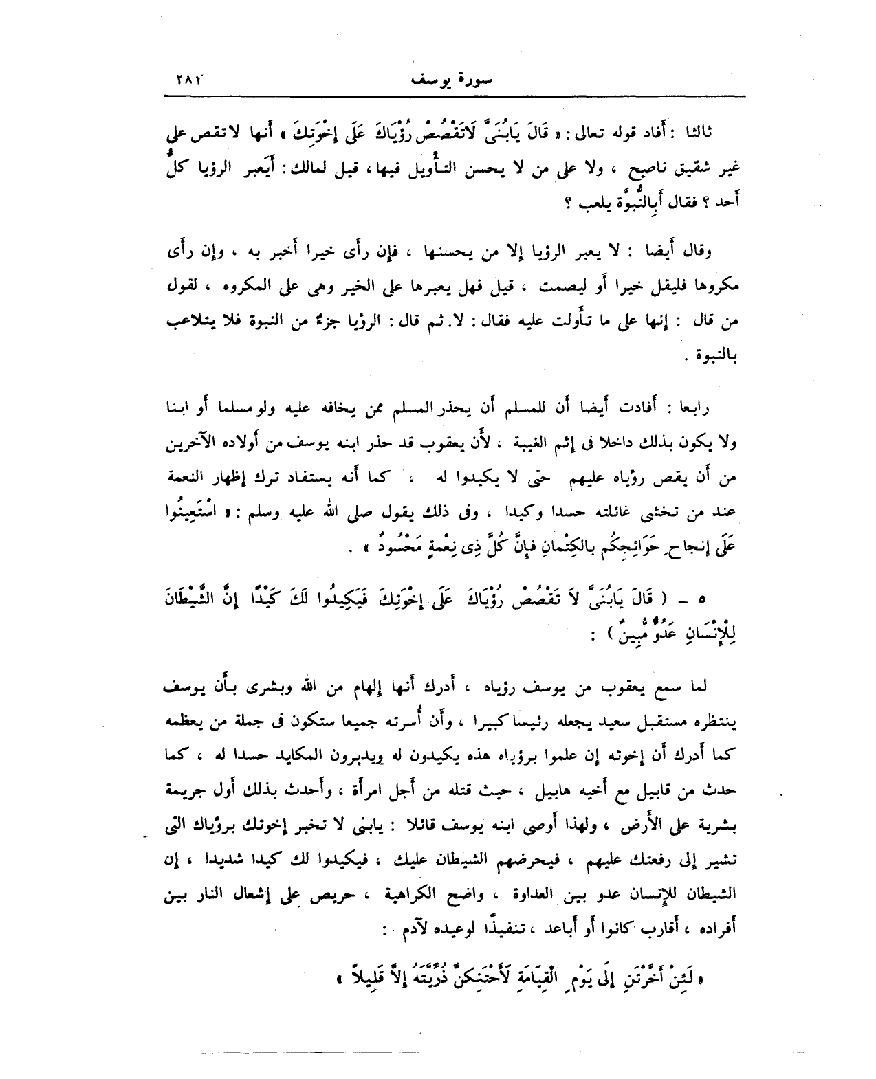 ثالثا: أفاد قوله تعالى: {قَالَ يَا بُنَيَّ لَا تَقْصُصْ رُؤْيَاكَ عَلَى إِخْوَتِكَ} أنها لا تقص على غير شقيق ناصح، ولا على من لا يحسن التأويل فيها، قيل لمالك: أيَعبر الرؤيا كل أحد؟ فقال أبِالنُّبوة يلعب؟