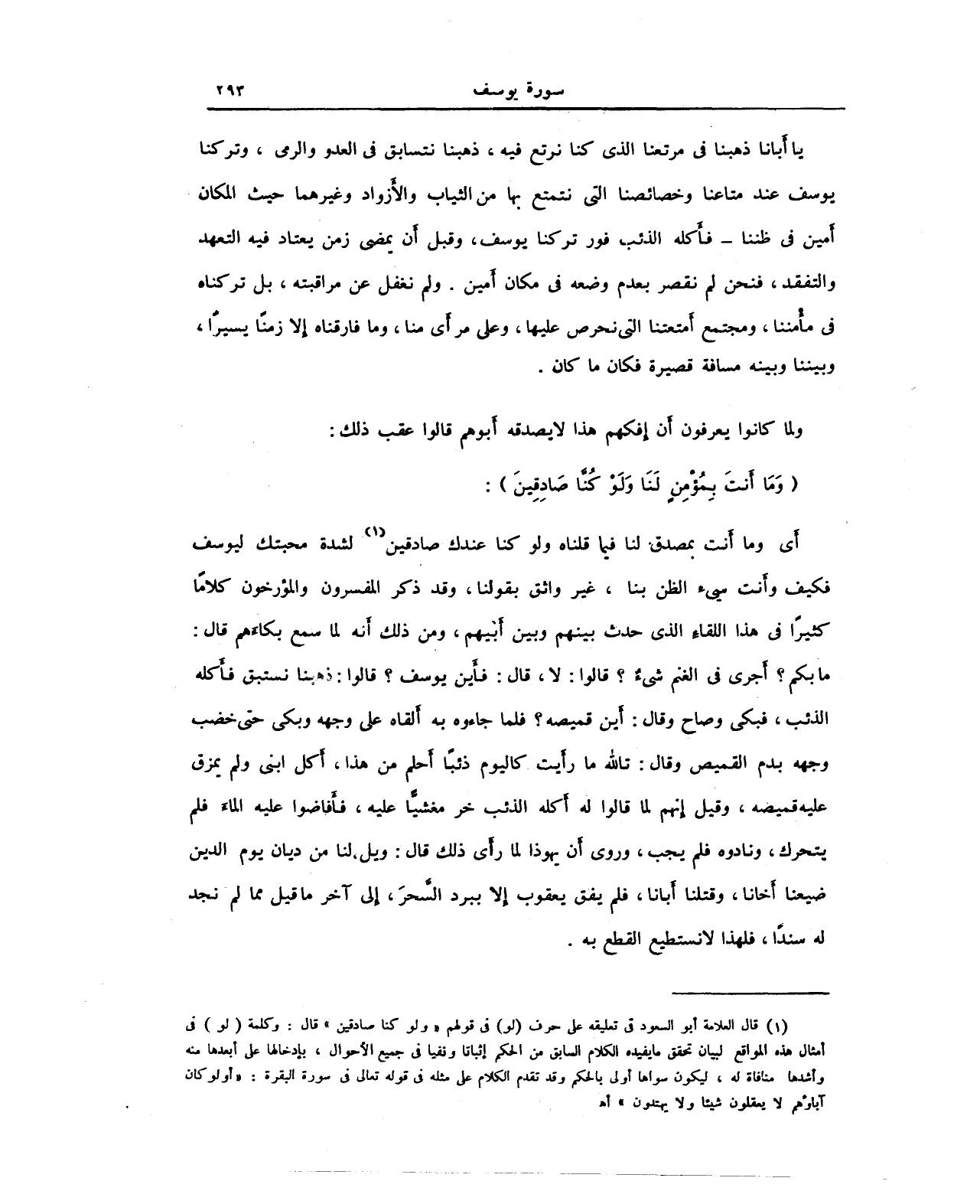 يا أَبانا ذهبنا في مرتعنا الذي كنا نرتع فيه، ذهبنا نتسابق في العدو والرمي، وتركنا يوسف عند متاعنا وخصائصنا التي نتمتع بها من الثياب والأزواد وغيرهما حيث المكان أَمين في ظننا - فأكله الذئب فور تركنا يوسف، وقبل أن يمضي زمن يعتاد فيه التعهد والتفقد، فنحن لم نقصر بعدم وضعه في مكان أمين. ولم نغفل عن مراقبته، بل تركناه في مأمننا، ومجتمع أَمتعتنا التي نحرص عليها، وعلى مرأَى منا، وما فارقناه إلا زمنا يسيرًا، وبيننا وبينه مسافة قصيرة فكان ما كان.