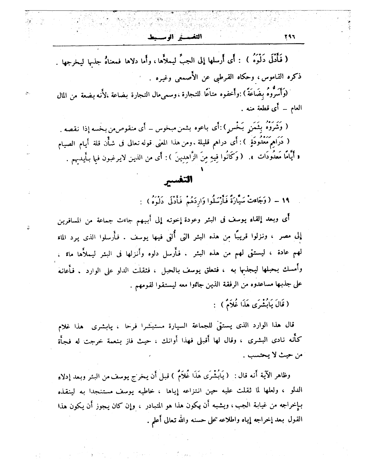 أي وبعد إلقاء يوسف في البئر وعودة إخوته إلى أَبيهم جاءَت جماعة من المسافرين إلى مصر، ونزلوا قريبًا من هذه البئر التي القى فيها يوسف. فأَرسلوا الذي يرد الماءَ لهم عادة، ليستقي لهم من هذه البئر، فأرسل دلوه وأَنزلها في البئر ليملأها ماءً.