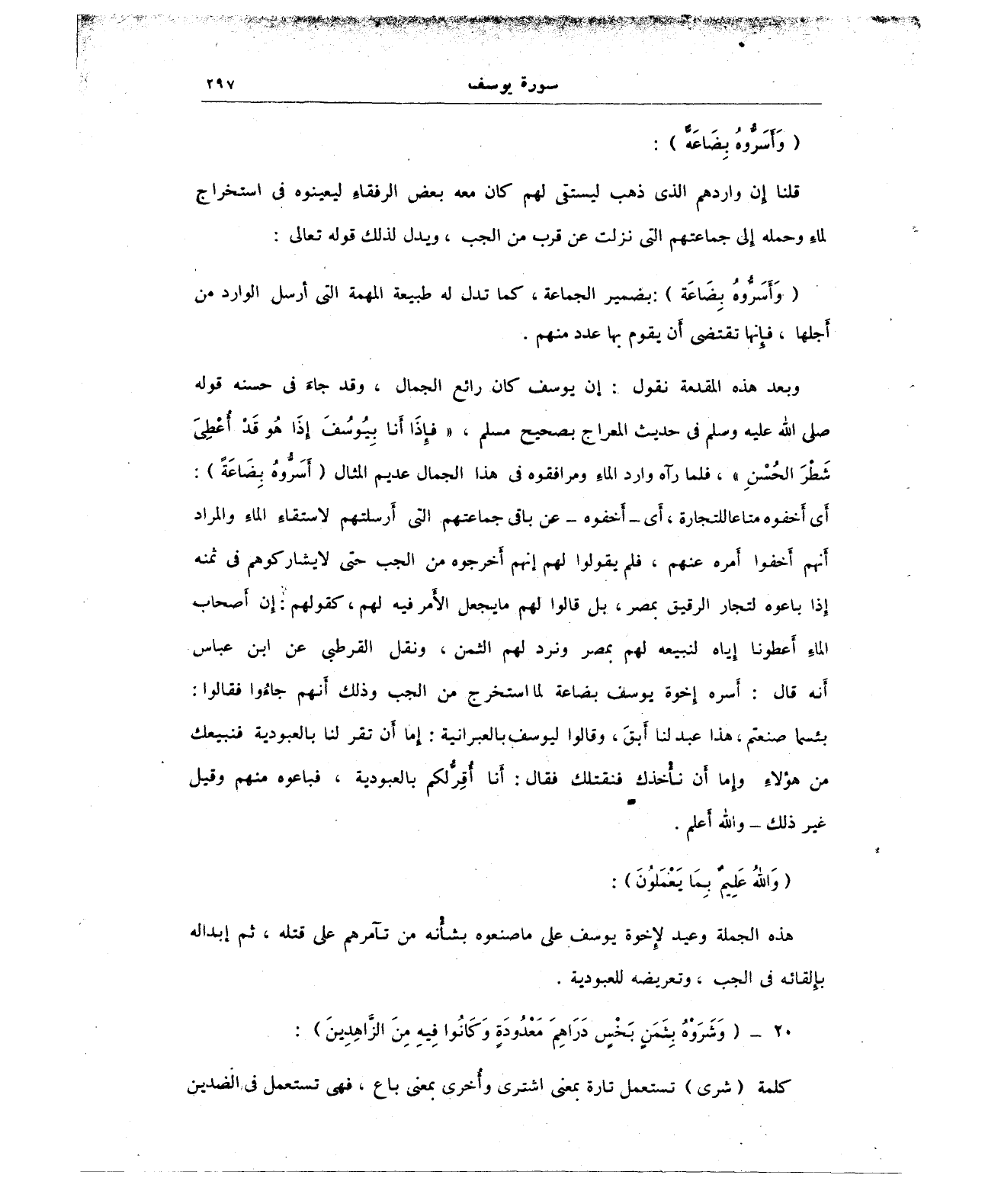 وبعد هذه المقدمة نقول: إن يوسف كان رائع الجمال، وقد جاءَ في حسنه قوله صلى الله عليه وسلم في حديث المعراج بصحيح مسلم، "فإِذَا أَنا بِيوسُفَ إذَا هُو قَدْ أعْطِىَ شَطْرَ الحُسْنِ"، فلما رآه وارد الماء ومرافقوه في هذا الجمال عديم المثال {وَأَسَرُّوهُ بِضَاعَةً}: أَي أخفوه متاعا للتجارة, أَي - أخفوه - عن باقى جماعتهم التى أَرسلتهم لاستقاء الماءِ والمراد أنهم أَخفوا أمره عنهم، فلم يقولوا لهم إنهم أخرجوه من الجب حتى لا يشاركوهم في ثمنه إِذا باعوه لتجار الرقيق بمصر، بل قالوا لهم ما يجعل الأمر فيه لهم، كقولهم: إن أصحاب الماءِ أَعطونا إياه لنبيعه لهم بمصر ونرد لهم الثمن، ونقل القرطبى عن ابن عباس أَنه قال: أَسره إخوة يوسف بضاعة لما استخرج من الجب وذلك أنهم جاءُوا فقالوا: بئسما صنعتم هذا عبد لنا أَبقَ، وقالوا ليوسف بالعبرانية: إما أن تقر لنا بالعبودية فنبيعك من هؤلاء وإما أن نأخذك فنقتلك فقال: أَنا أقِرُّ لكم بالعبودية، فباعوه منهم وقيل غير ذلك - والله أعلم.