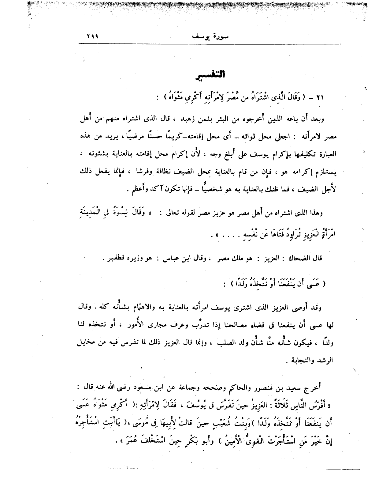 وقد أوصى العزيز الذي اشترى يوسف امرأته بالعناية به والاهتمام بشأنه كله، وقال لها عسى أن ينفعنا في قضاء مصالحنا إذا تدرَّب وعرف مجارى الأمور، أو نتخذه لنا ولدًا، فيكون شأنه منَّا شأن ولد الصلب، وإنما قال العزيز ذلك لما تفرس فيه من مخايل الرشد والنجابة.