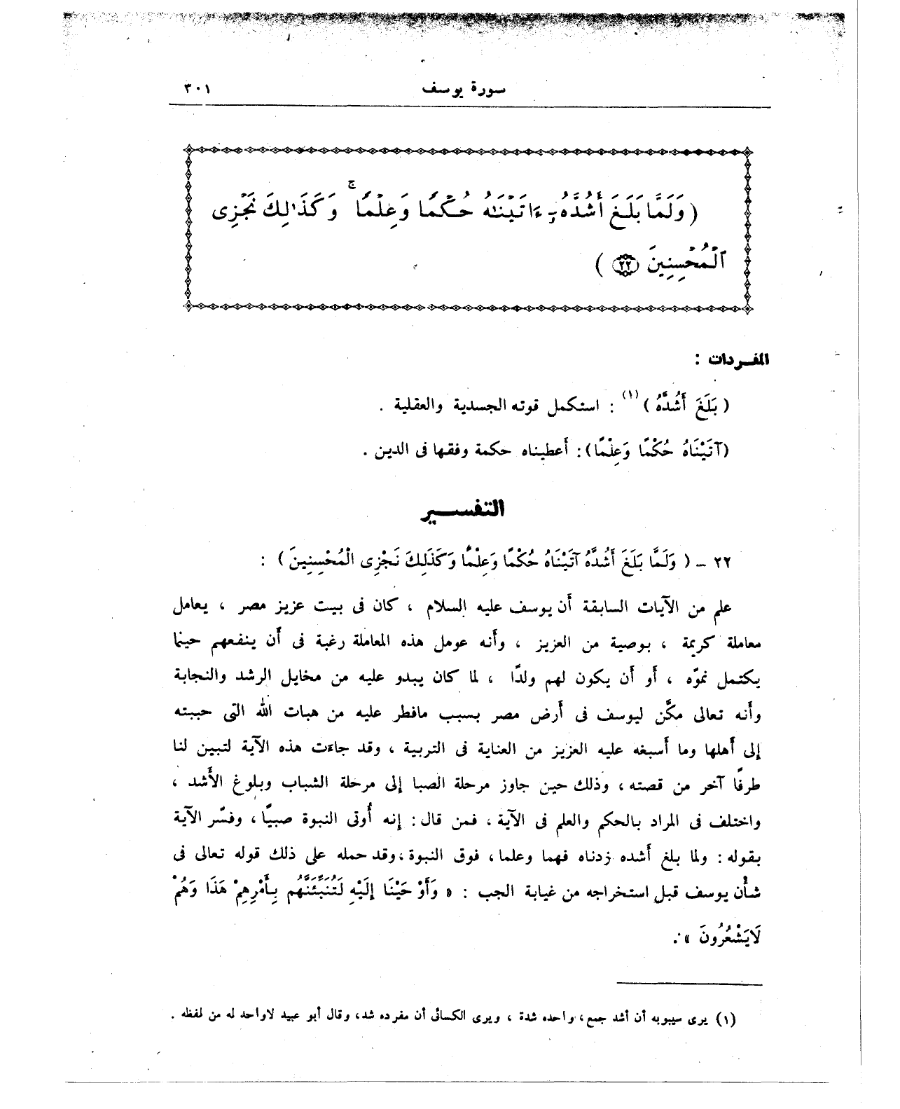 22 - {وَلَمَّا بَلَغَ أَشُدَّهُ آتَيْنَاهُ حُكْمًا وَعِلْمًا وَكَذَلِكَ نَجْزِي الْمُحْسِنِينَ}: