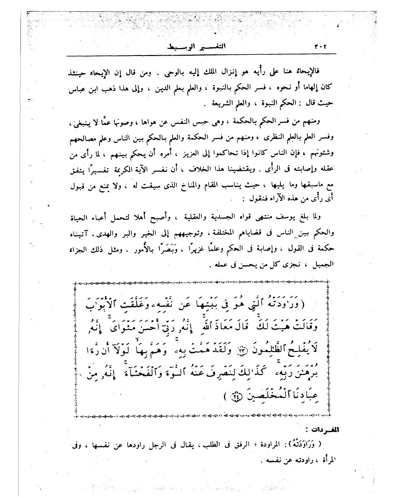 {وَرَاوَدَتْهُ الَّتِي هُوَ فِي بَيْتِهَا عَنْ نَفْسِهِ وَغَلَّقَتِ الْأَبْوَابَ وَقَالَتْ هَيْتَ لَكَ قَالَ مَعَاذَ اللَّهِ إِنَّهُ رَبِّي أَحْسَنَ مَثْوَايَ إِنَّهُ لَا يُفْلِحُ الظَّالِمُونَ (23) وَلَقَدْ هَمَّتْ بِهِ وَهَمَّ بِهَا لَوْلَا أَنْ رَأَى بُرْهَانَ رَبِّهِ كَذَلِكَ لِنَصْرِفَ عَنْهُ السُّوءَ وَالْفَحْشَاءَ إِنَّهُ مِنْ عِبَادِنَا الْمُخْلَصِينَ (24)}