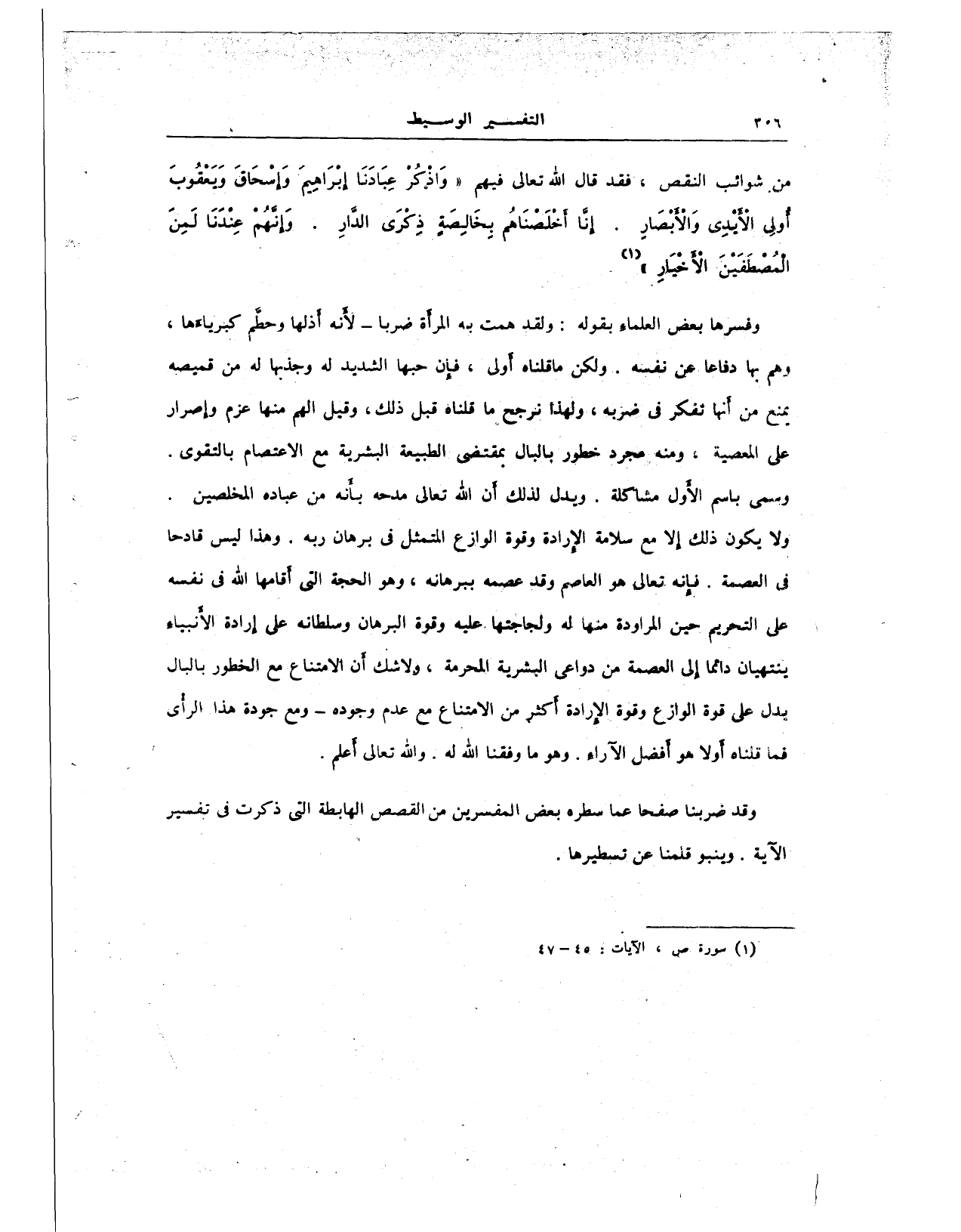 ولا يكون ذلك إلا مع سلامة الإرادة وقوة الوازع المتمثل في برهان ربه. وهذا ليس قادحا في العصمة. فإنه تعالى هو العاصم وقد عصمه ببرهانه، وهو الحجة التي أقامها الله في نفسه على التحريم حين المراودة منها له ولجاجتها عليه وقوة البرهان وسلطانه على إرادة الأنبياء ينتهيان دائما إلى العصمة من دواعى البشرية المحرمة، ولا شك أن الامتناع مع الخطور بالبال يدل على قوة الوازع وقوة الإرادة أكثر من الامتناع مع عدم وجوده - ومع جودة هذا الرأى فما قلناه أَولا هو أفضل الآراء. وهو ما وفقنا الله له. والله تعالى أعلم.