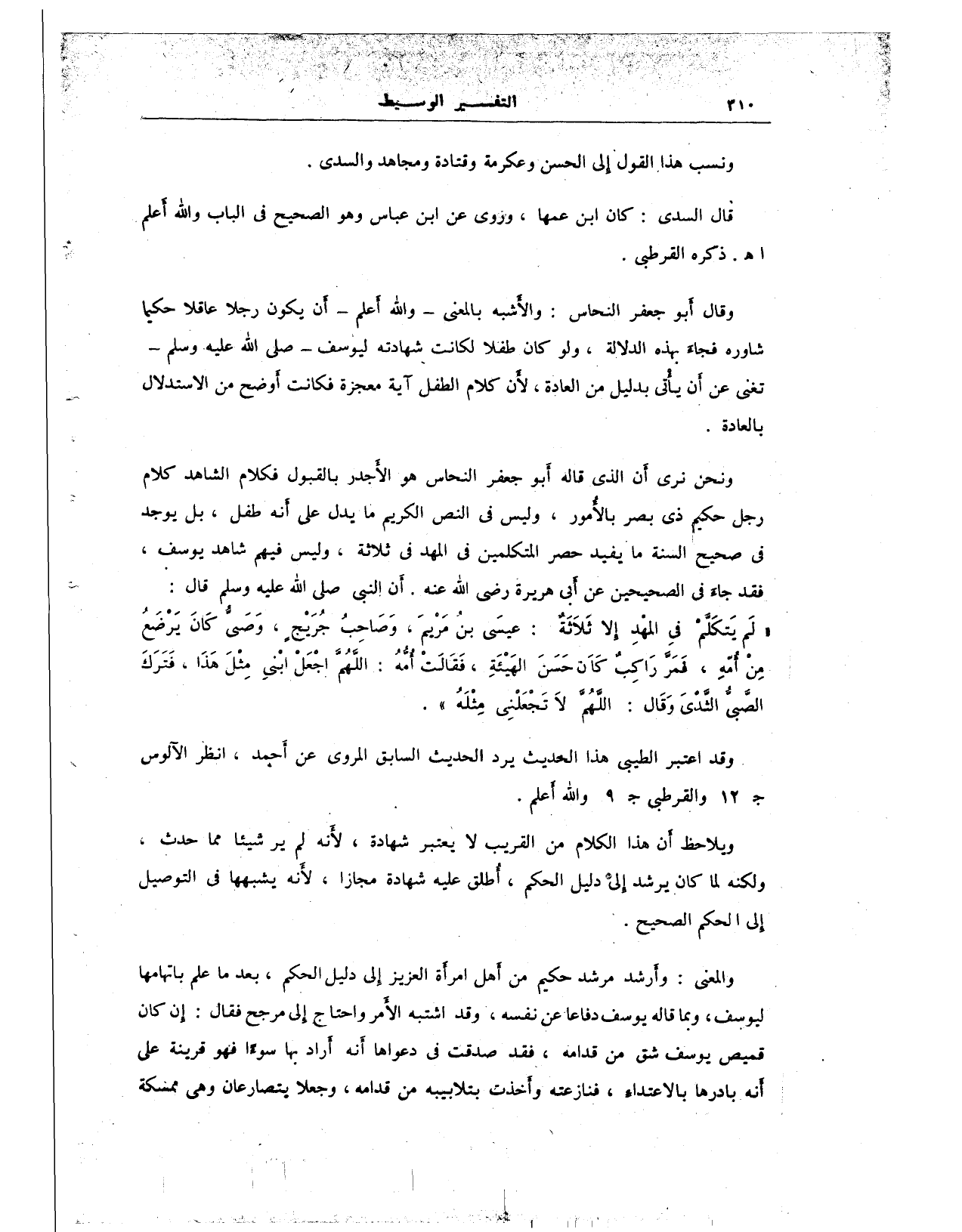 ونحن نرى أن الذي قاله أَبو جعفر النحاس هو الأجدر بالقبول فكلام الشاهد كلام رجل حكيم ذى بصر بالأمور، وليس في النص الكريم ما يدل على أنه طفل، بل يوجد في صحيح السنة ما يفيد حصر المتكلمين في المهد في ثلاثة، وليس فيهم شاهد يوسف، فقد جاء في الصحيحين عن أَبي هريرة رضى الله عنه. أَن النبي صلى الله عليه وسلم قال: "لَم يَتكَلَّم فىِ المهدِ إلا ثَلاَثَة: عيسَى بنُ مَرْيمَ، وَصَاحِبُ جُرَيْج، وَصَبيُّ كَانَ يَرْضَعُ مِنْ أمّهِ، فمَرَّ رَاكِبٌ كَاَن حَسَنَ الهَيْئَةِ، فَقَالَتْ أمه: اللهم اجْعَل ابْنىِ مِثْل هَذَا, فَتَرَكَ الصَّبىُّ الثدْىَ وَقَال: اللهُمَّ لاَ تَجْعَلنى مِثْلَهُ".