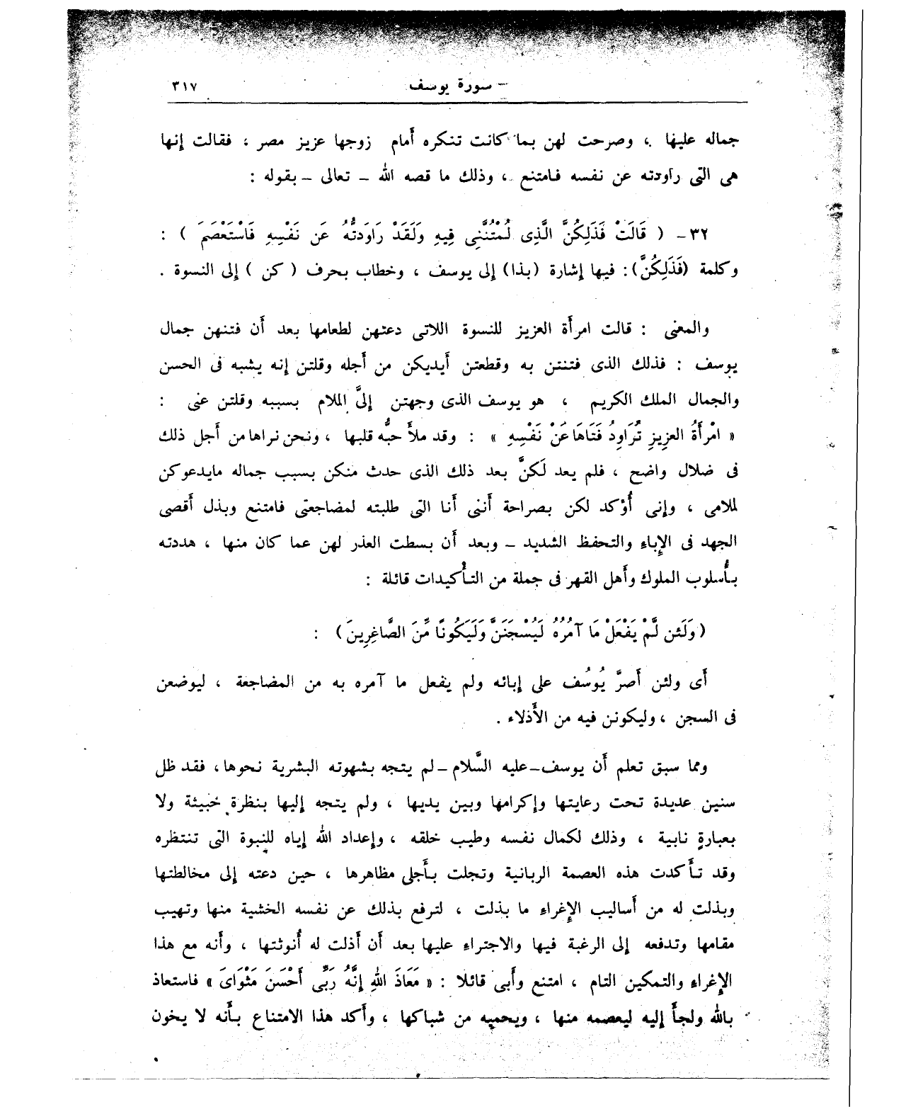 والمعنى: قالت امرأَة العزيز للنسوة اللاتى دعتهن لطعامها بعد أَن فتنهن جمال يوسف: فذلك الذي فتنتن به وقطعتن أَيديكن من أجله وقلتن إنه يشبه في الحسن والجمال الملك الكريم، هو يوسف الذي وجهتن إلىَّ الملام بسببه وقلتن عنى: {امْرَأَتُ الْعَزِيزِ تُرَاوِدُ فَتَاهَا عَنْ نَفْسِهِ}: وقد ملأ حبُّه قلبها، ونحن نراها من أَجل ذلك في ضلال واضح، فلم يعد لَكنَّ بعد ذلك الذي حدث منكن بسبب جماله ما يدعوكن لملامى، وإنى أؤكد لكن بصراحة أننى أنا التي طلبته لمضاجعتى فامتنع وبذل أقصى الجهد في الإِباء والتحفظ الشديد - وبعد أن بسطت العذر لهن عما كان منها، هددته بأسلوب الملوك وأهل القهر في جملة من التأكيدات قائلة: