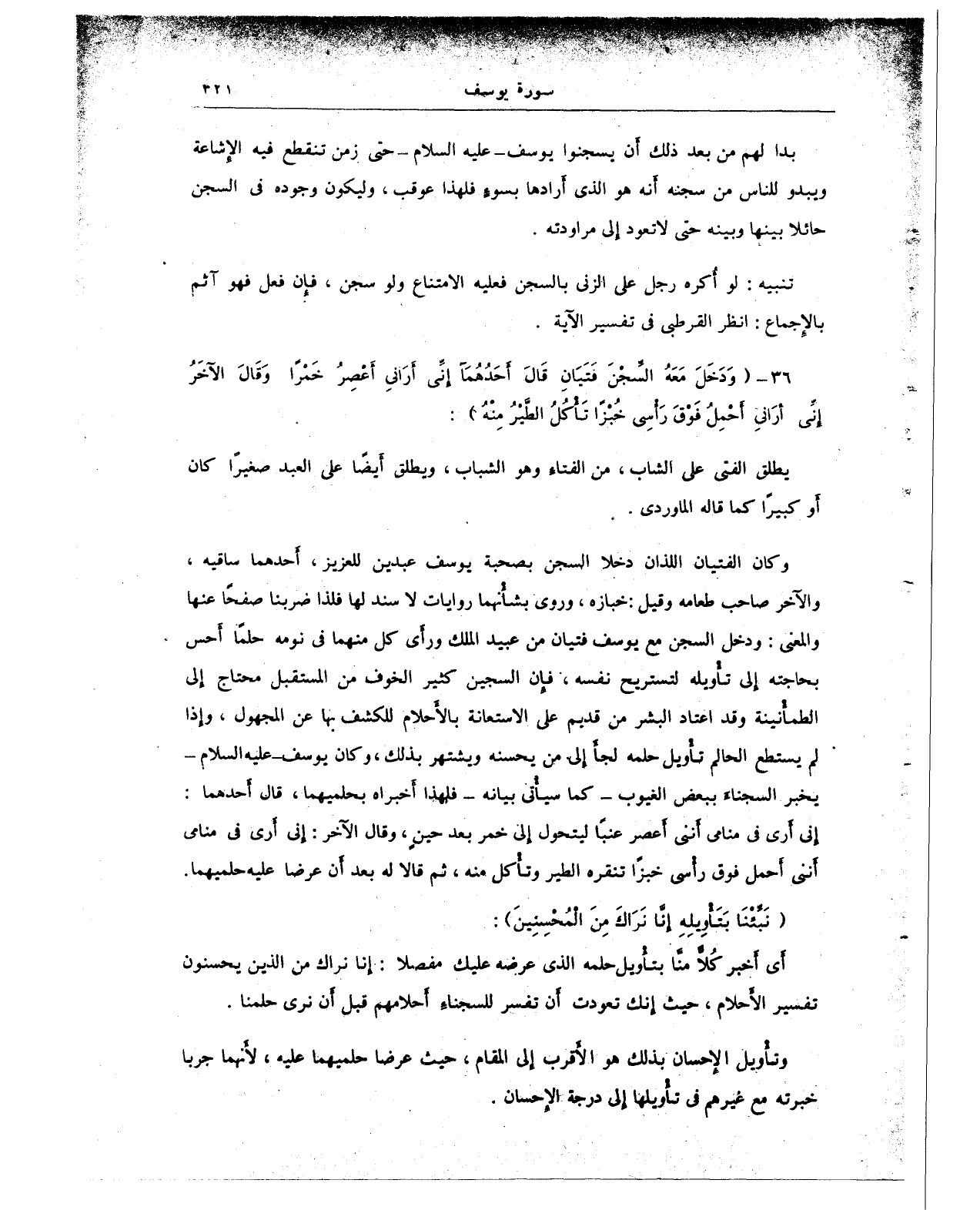 وكان الفتيان اللذان دخلا السجن بصحبة يوسف عبدين للعزيز، أحدهما ساقيه، والآخر صاحب طعامه وقيل: خبازه، وروى بشأنهما روايات لا سند لها فلذا ضربنا صفحا عنها والمعنى: ودخل السجن مع يوسف فتيان من عبيد الملك ورأَى كل منهما في نومه حلمًا أَحس بحاجته إِلى تأويله لتستريح نفسه، فإن السجين كثير الخوف من المستقبل محتاج إِلى الطمأنينة وقد اعتاد البشر من قديم على الاستعانة بالأحلام للكشف بها عن المجهول، وإذا لم يستطع الحالم تأويل حلمه لجأ إلى من يحسنه ويشتهر بذلك، وكان يوسف - عليه السلام - يخبر السجناء ببعض الغيوب - كما سيأتي بيانه - فلهذا أخبراه بحلميهما، قال أَحدهما: إِني أَرى في منامي أنني أعصر عنبًا ليتحول إلى خمر بعد حينٍ، وقال الآخر: إني أرى في منامي أَننى أحمل فوق رأسى خبزًا تنقره الطير وتأكل منه، ثم قالا له بعد أَن عرضا عليه حلميهما.