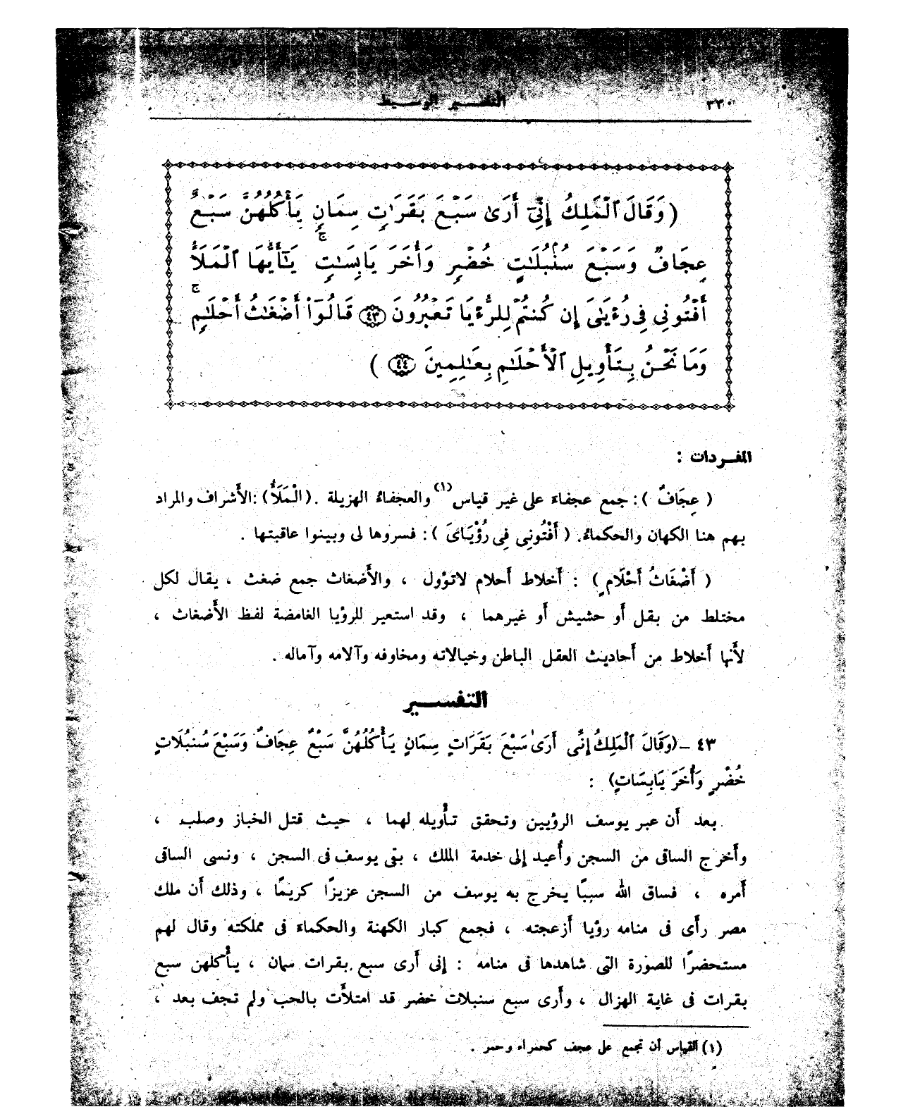 {وَقَالَ الْمَلِكُ إِنِّي أَرَى سَبْعَ بَقَرَاتٍ سِمَانٍ يَأْكُلُهُنَّ سَبْعٌ عِجَافٌ وَسَبْعَ سُنْبُلَاتٍ خُضْرٍ وَأُخَرَ يَابِسَاتٍ يَا أَيُّهَا الْمَلَأُ أَفْتُونِي فِي رُؤْيَايَ إِنْ كُنْتُمْ لِلرُّؤْيَا تَعْبُرُونَ (43) قَالُوا أَضْغَاثُ أَحْلَامٍ وَمَا نَحْنُ بِتَأْوِيلِ الْأَحْلَامِ بِعَالِمِينَ (44)}