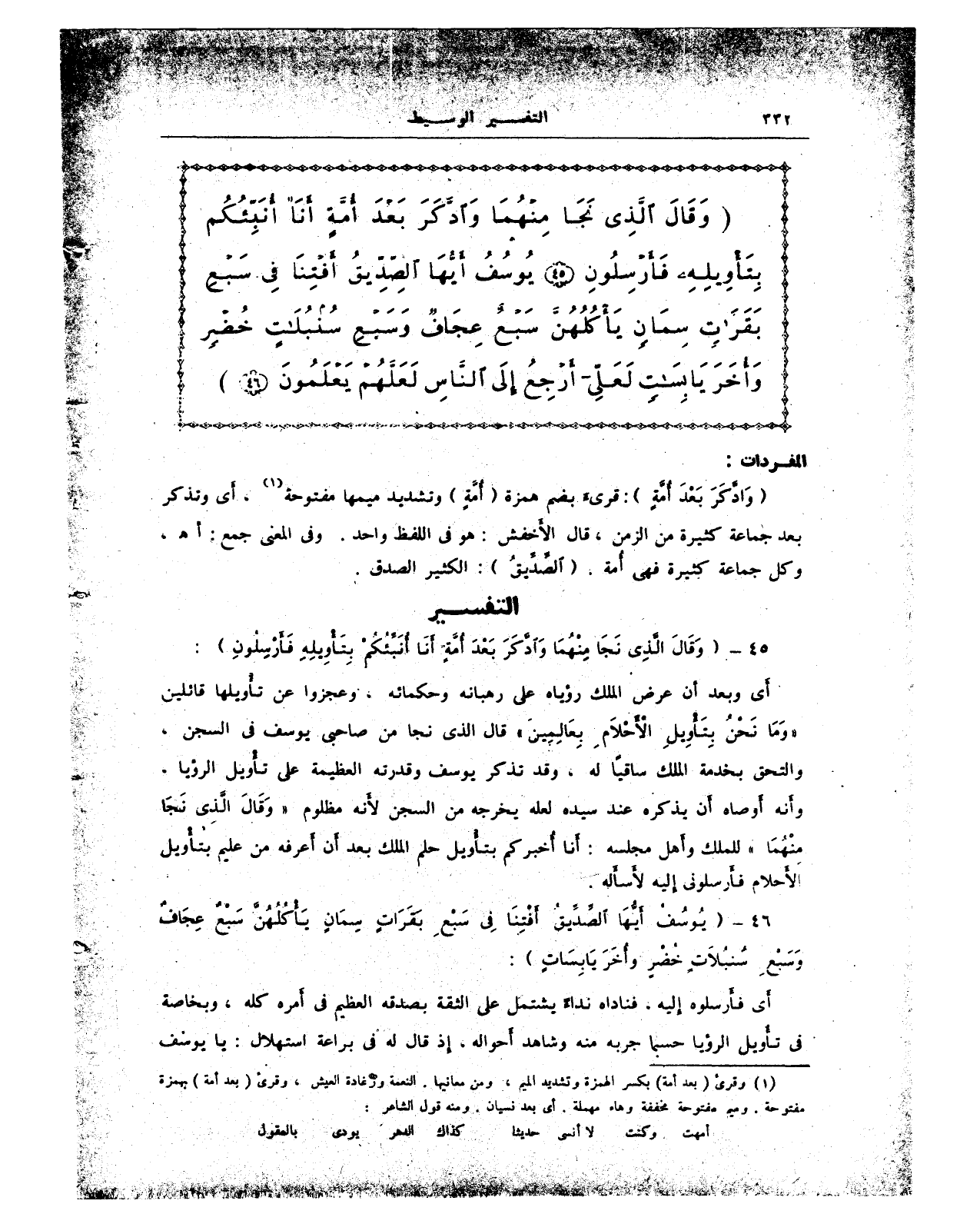 {وَقَالَ الَّذِي نَجَا مِنْهُمَا وَادَّكَرَ بَعْدَ أُمَّةٍ أَنَا أُنَبِّئُكُمْ بِتَأْوِيلِهِ فَأَرْسِلُونِ (45) يُوسُفُ أَيُّهَا الصِّدِّيقُ أَفْتِنَا فِي سَبْعِ بَقَرَاتٍ سِمَانٍ يَأْكُلُهُنَّ سَبْعٌ عِجَافٌ وَسَبْعِ سُنْبُلَاتٍ خُضْرٍ وَأُخَرَ يَابِسَاتٍ لَعَلِّي أَرْجِعُ إِلَى النَّاسِ لَعَلَّهُمْ يَعْلَمُونَ (46)}