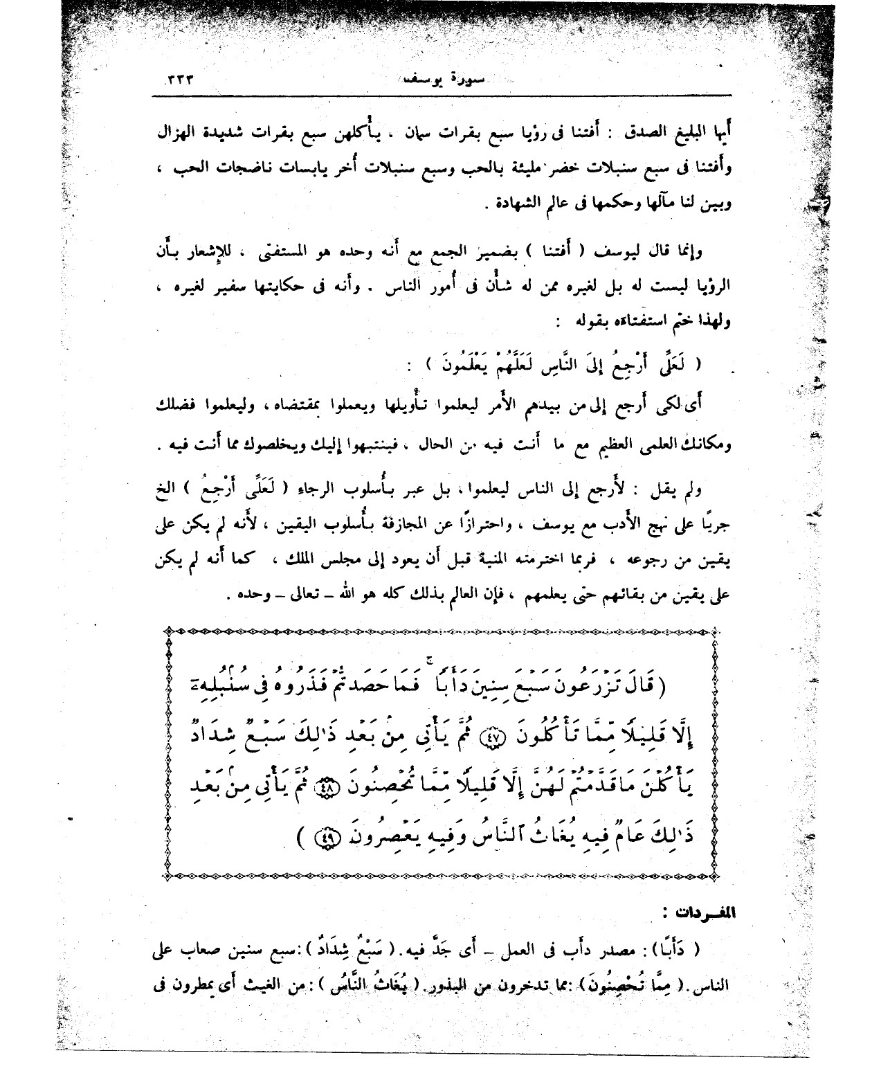 {دَأَبًا}: مصدر دأب في العمل - أي جَدَّ فيه. {سَبْعٌ شِدَادٌ}: سبع سنين صعاب على الناس. {مِمَّا تُحْصِنُونَ}: مما تدخرون من البذور {يُغَاثُ النَّاسُ}: من الغيث أي يمطرون في