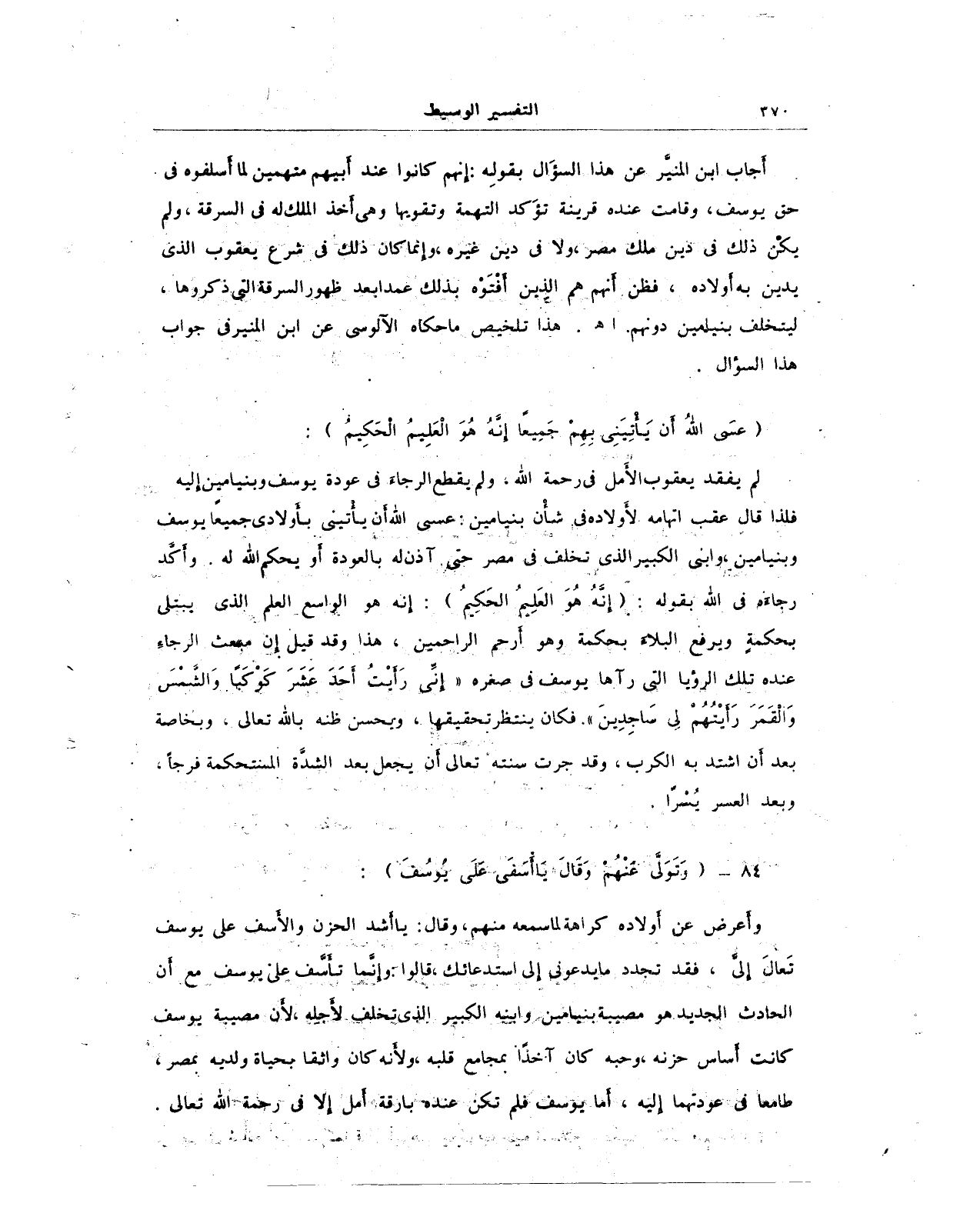 وأَعرض عن أَولاده كراهة لما سمعه منهم، وقال: يا أشد الحزن والأَسف على يوسف تَعال إِلى، فقد تجدد ما يدعونى إِلى استدعائك، قالوا: وإِنَّما تأَسَّف على يوسف مع أَن الحادث الجديد هو مصيبة بنيامين وابنه الكبير الذي تخلف لأَجله، لأَن مصيبة يوسف كانت أَساس حزنه، وحبه كان آخذًا بمجامع قلبه، ولأَنه كان واثقا بحياة ولديه بمصر، طامعا في عودتهما إِليه، أَما يوسف لم تكن عنده بارقة أَمل إِلا فى رحمة الله تعالى.