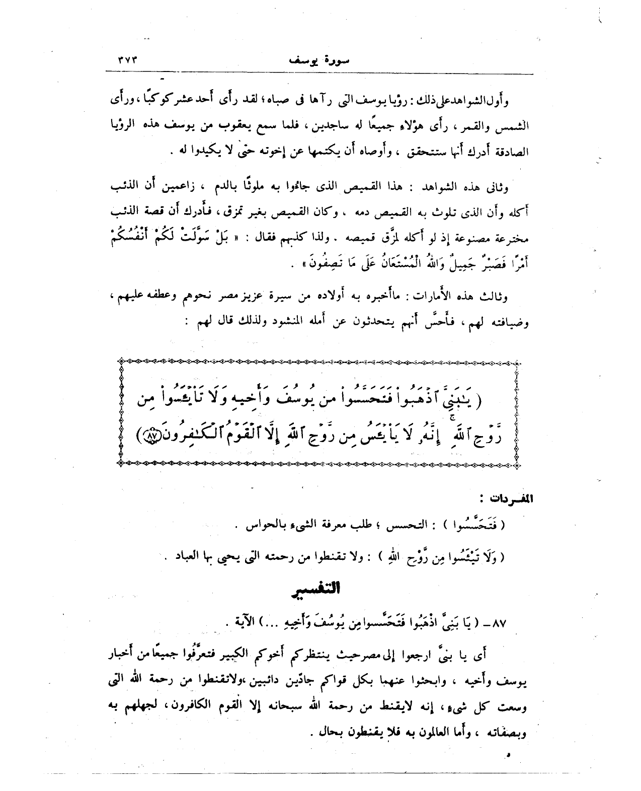 87 - (يَا بَنِيَّ اذْهَبُوا فَتَحَسَّسُوا مِنْ يُوسُفَ وَأَخِيهِ0 ... ) الآية.