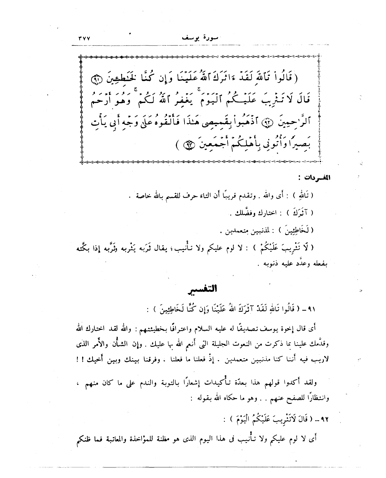 أَي قال إِخوة يوسف تصديقًا له عليه السلام واعترافًا بخطيئتهم: والله لقد اختارك الله وقدَّمك علينا بما ذكرت من النعوت الجليلة التي أَنعم الله بها عليك. وإِن الشأْن والأَمر الذي لا ريب فيه أَننا كنا مذنبين متعمدين إِذْ فعلنا ما فعلنا. وفرقنا بينك وبين أخيك!!