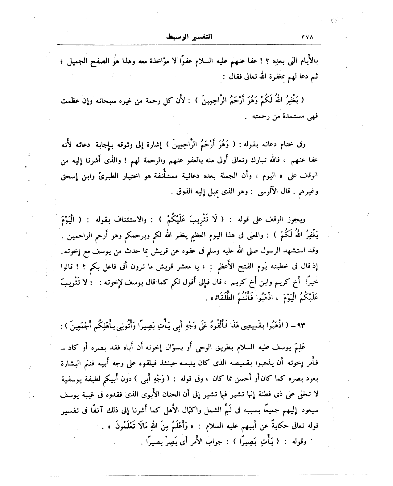 ويجوز الوقف على قوله: (لاَ تَثْرِيبَ عَلَيْكُمْ): والاستئناف بقوله: (الْيَوْمَ يَغْفِرُ اللهُ لَكُمْ): والمعنى في هذا اليوم العظيم يغفر الله لكم ويرحمكم وهو أَرحم الراحمين. وقد استشهد الرسول صلى الله عليه وسلم في عفوه عن قريش بما حدث من يوسف مع إِخوته. إِذ قال في خطبته يوم الفتح الأَعظم: "يا معشر قريش ما ترون أَني فاعل بكم؟! قالوا خيرًا أَخ كريم وابن أَخ كريم، قال فإِني أقول لكم كما قال يوسف لإخوته: "لا تَثْريبَ عَلَيْكُمُ الْيَوْمَ، اذهَبُوا فَأَنْتُمُ الطُّلَقَاءُ".