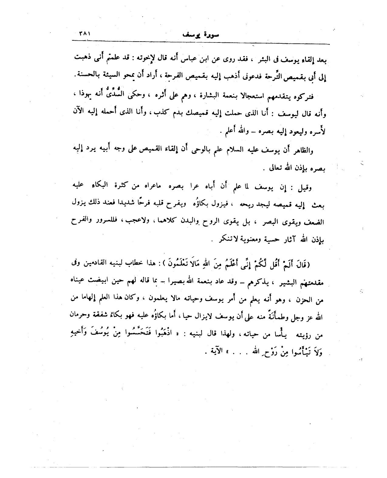 وقيل: إِن يوسف لما علم أَن أباه عرا بصره ما عراه من كثرة البكاء عليه بعث إِليه قميصه ليجد ريحه، فيزول بكاؤُه ويفرح قلبه فرحًا شديدا فعند ذلك يزول الضعف ويقوى البصر، بل يقوى الروح والبدن كلاهما، ولا عجب، فللسرور والفرح بإِذن الله آثار حسية ومعنوية لا تنكر.