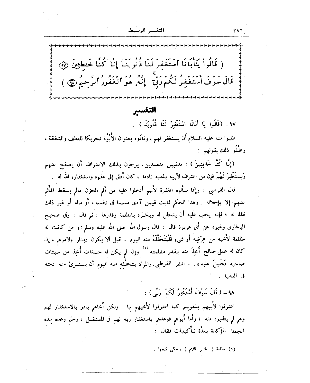 {قَالُوا يَا أَبَانَا اسْتَغْفِرْ لَنَا ذُنُوبَنَا إِنَّا كُنَّا خَاطِئِينَ (97) قَالَ سَوْفَ أَسْتَغْفِرُ لَكُمْ رَبِّي إِنَّهُ هُوَ الْغَفُورُ الرَّحِيمُ (98)}