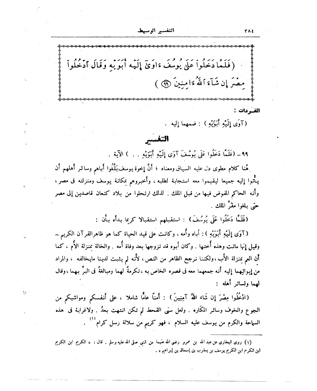 99 - (فَلَمَّا دَخَلُوا عَلَى يُوسُفَ آوَى إِلَيْهِ أَبَوَيْهِ ... ) الآية.