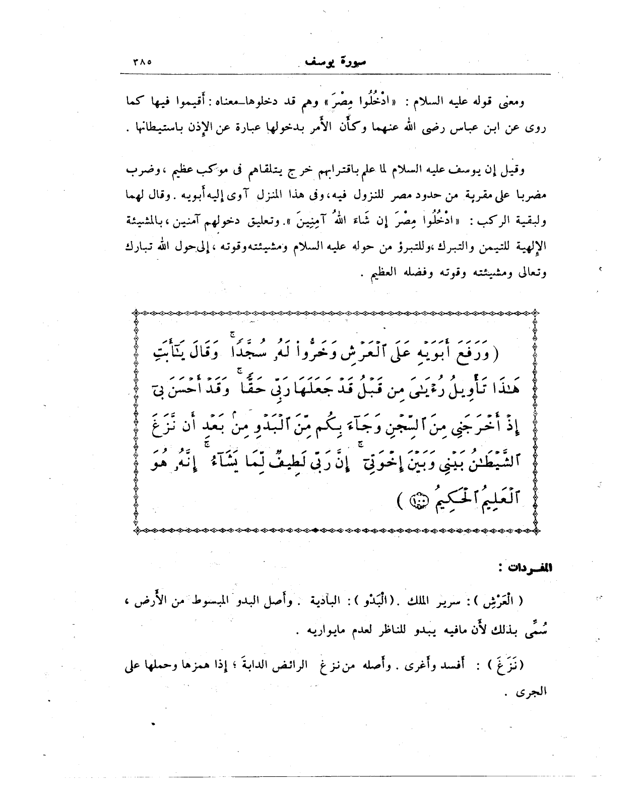 {وَرَفَعَ أَبَوَيْهِ عَلَى الْعَرْشِ وَخَرُّوا لَهُ سُجَّدًا وَقَالَ يَا أَبَتِ هَذَا تَأْوِيلُ رُؤْيَايَ مِنْ قَبْلُ قَدْ جَعَلَهَا رَبِّي حَقًّا وَقَدْ أَحْسَنَ بِي إِذْ أَخْرَجَنِي مِنَ السِّجْنِ وَجَاءَ بِكُمْ مِنَ الْبَدْوِ مِنْ بَعْدِ أَنْ نَزَغَ الشَّيْطَانُ بَيْنِي وَبَيْنَ إِخْوَتِي إِنَّ رَبِّي لَطِيفٌ لِمَا يَشَاءُ إِنَّهُ هُوَ الْعَلِيمُ الْحَكِيمُ (100)}