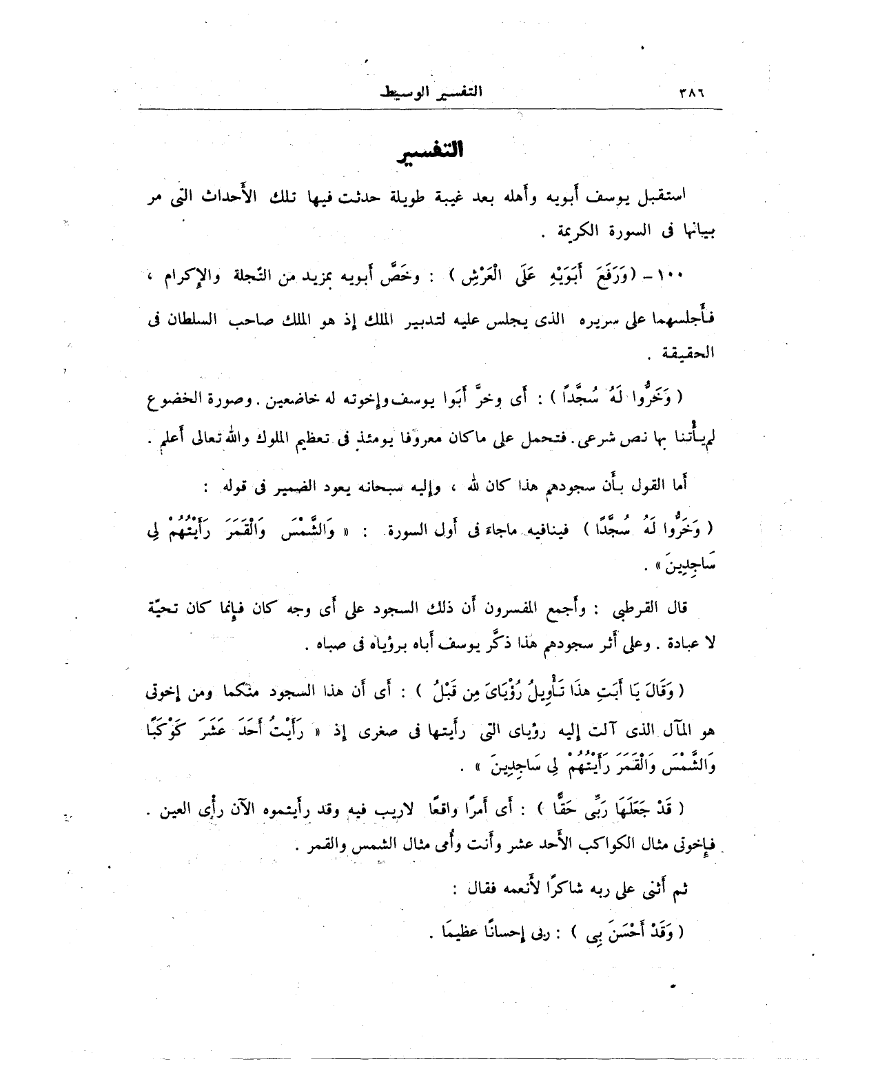قال القرطبى: وأَجمع المفسرون أَن ذلك السجود على أَي وجه كان فإِنما كان تحيّة لا عبادة. وعلى أَثر سجودهم هذا ذكَّر يوسف أَباه برؤياه في صباه.